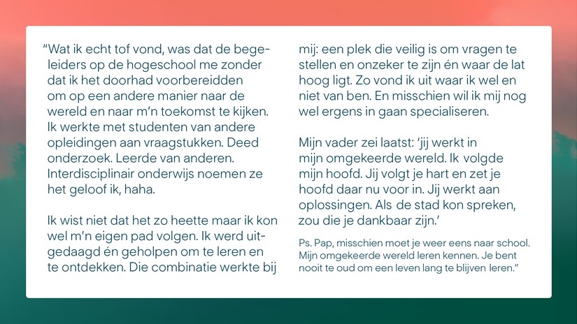 Uitdagingen zien we als kansen om van te leren en om van te groeien. Met die instelling leiden we onze studenten op tot veerkrachtige professionals en richten we onze organisatie in op wendbaarheid.