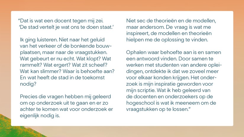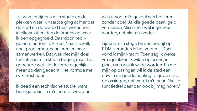 Slimmer werken wordt noodzakelijk. We willen bijdragen aan een economie waarin we betekenisvolle activiteiten ontplooien. Een toekomstbestendige economie vraagt om toekomstbestendige organisaties. Waar nieuwe technologie verantwoord wordt benut. Als kennisinstelling richten we ons met onderwijs en onderzoek op innovaties rondom deze vraagstukken. Oplossingen die praktisch, laagdrempelig en direct toepasbaar zijn. Daarbij streven we naar duurzame samenwerkingsverbanden in de stad en de regio, met (mkb) bedrijven, zorginstellingen, overheden en burgers. Want toekomst maken doen we samen.