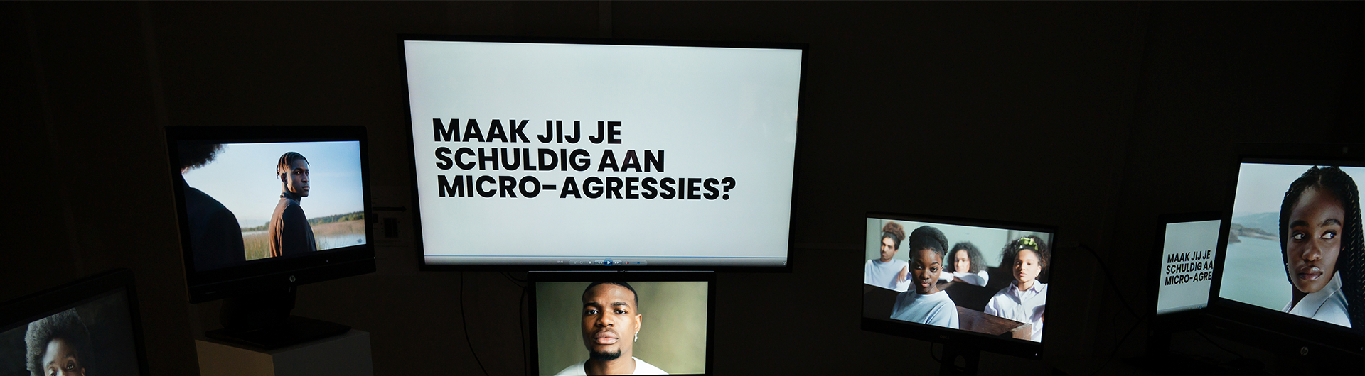 "In mijn werk heb je verschillende lagen met voice-over, de flitsen staan voor de microagressie en het gepiep is dat wat onbewust bijblijft. Dat wat je later nog terug gaat horen, net zoals dat is bij microagressie. De schermen staan in een cirkel met in het midden een lage stoel.