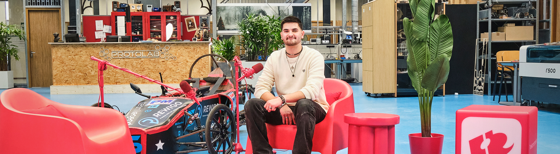 Op de RDM Campus staat Fabian midden in de wereld van innovatie. Hij bouwt voertuigen, ontwerpt slimme onderdelen en denkt na over de techniek van morgen. “Je bent hier niet alleen met theorie bezig, maar werkt ook echt met je handen aan toffe projecten,” vertelt hij.