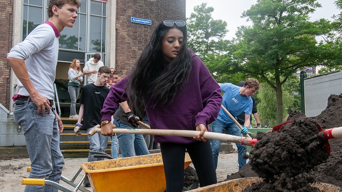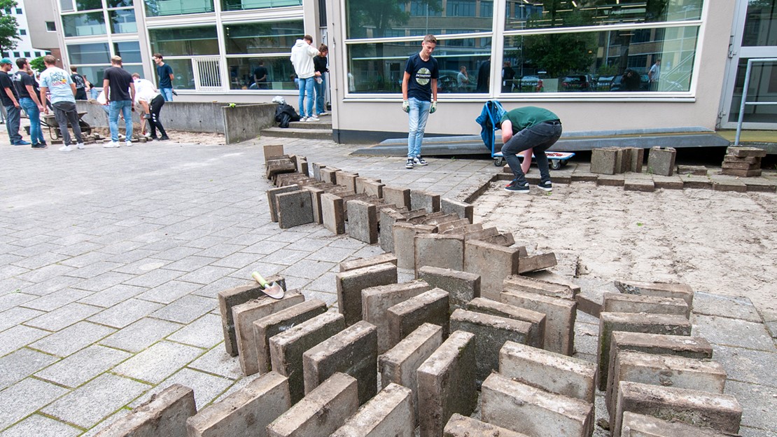 Op vrijdag 1 september staken meer dan zestig eerstejaars de handen uit de mouwen om op het Academieplein, waaraan het gebouw van hun onderwijsinstituut ligt, ruim 100 vierkante meter tegels te verwijderen en te verruilen voor planten en bloemen. In totaal gingen 1.132 stoeptegels eruit om plaats te maken voor groen.