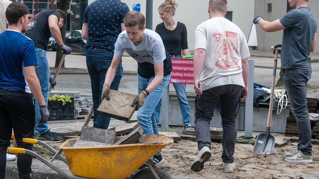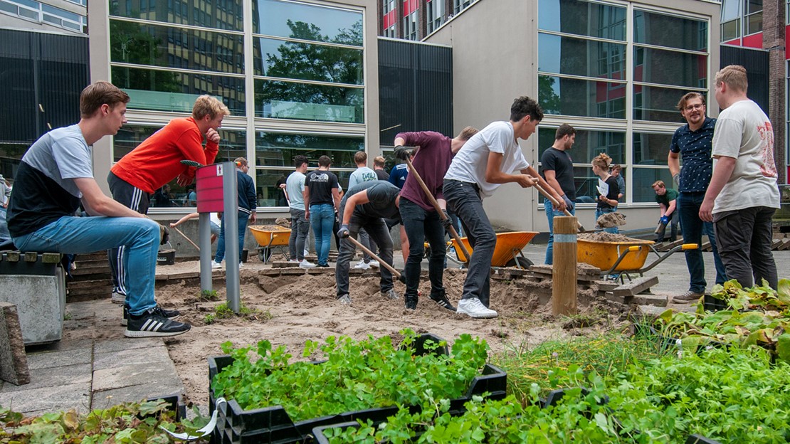 Tijdens hun introductieweek mochten de nieuwe studenten aan de slag om de omgeving van het gebouw waar ze gaan studeren groener, klimaatbestendiger en aantrekkelijker te maken. Voor zichzelf omdat ze hier vaak zullen zijn, maar ook voor buurtgenoten, studenten en medewerkers.
