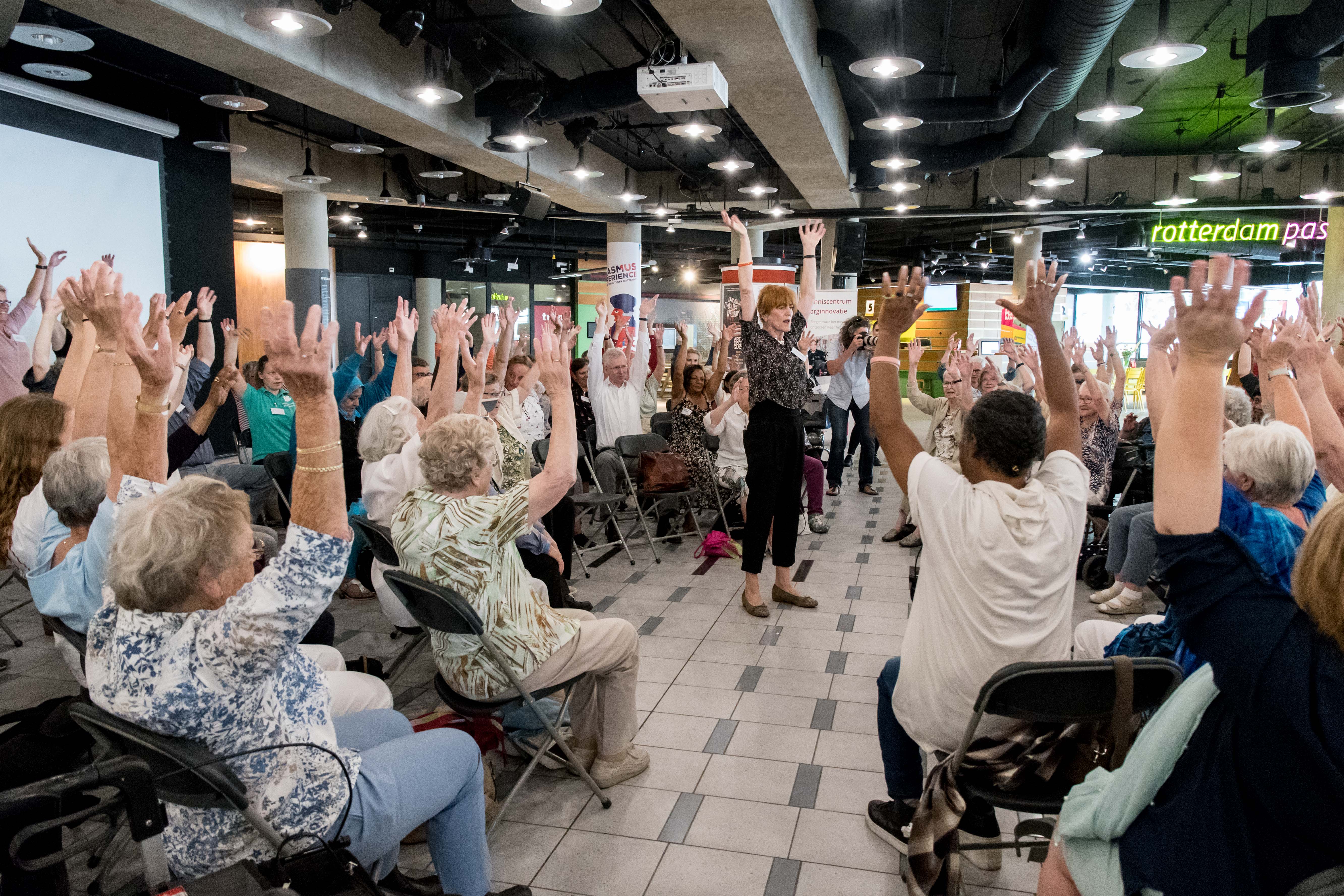 Iedereen kon meedoen met Aukje Aardema van het Geheugenpaleis, die de oefeningen uitvoerde samen met ongeveer twintig ouderen, die deze ontmoetingslocaties voor mensen met ernstige geheugenklachten en beginnende dementie wekelijks bezoeken.
