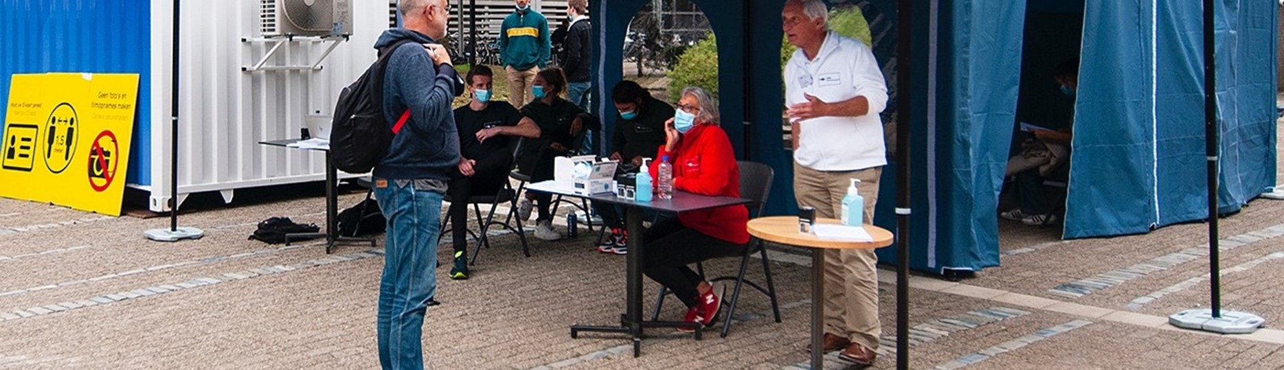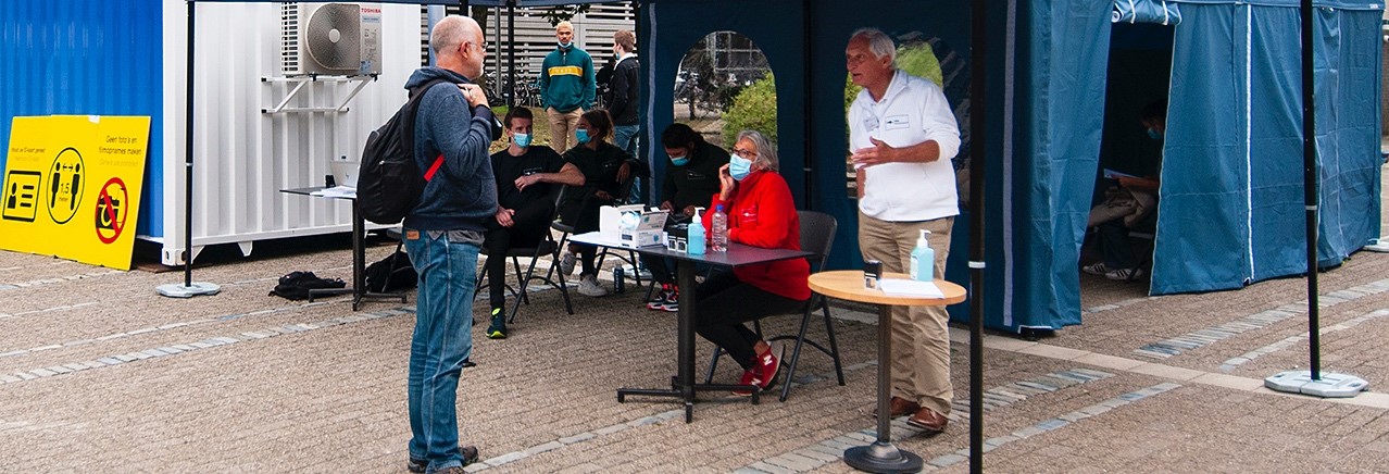 Ook een paar meter verderop is het druk. Bij de tijdelijke priklocatie van GGD Rotterdam staan zes mensen in de rij om zich te laten registreren voor een vaccinatie. Studenten en medewerkers kunnen hier in ieder geval tot en met 16 september op dinsdag, woensdag en donderdag tussen 09:00 en 16:00 uur zonder afspraak terecht voor het Pfizer-vaccin.