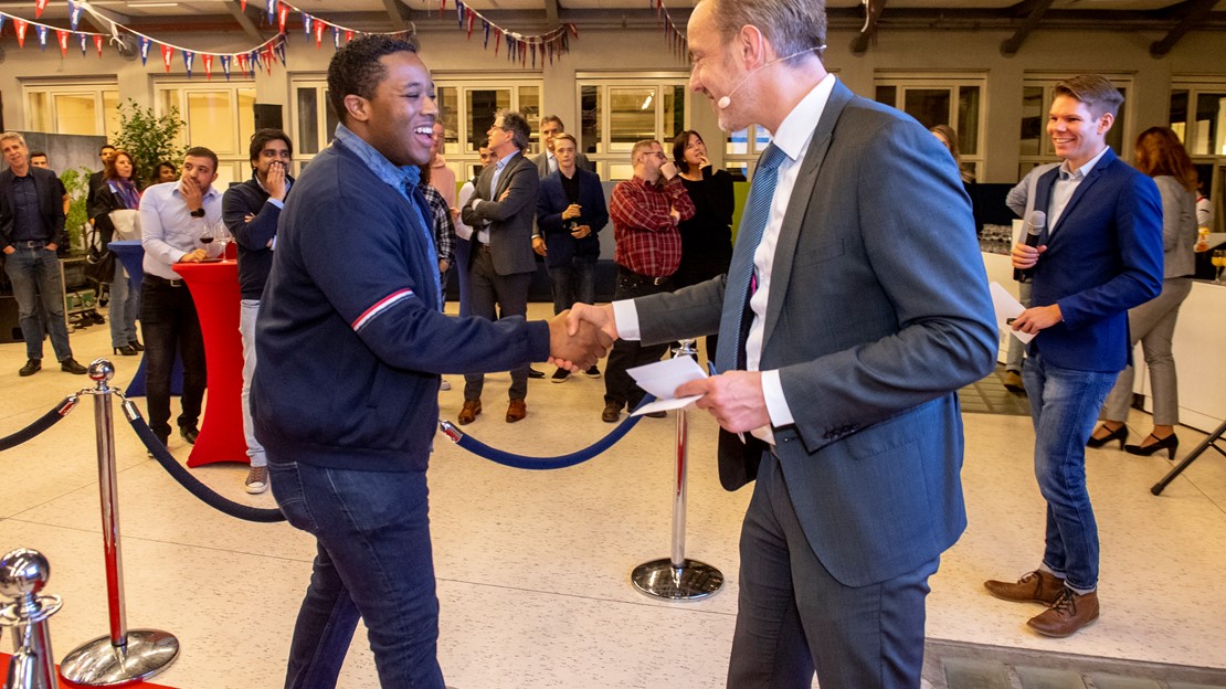 Tekst gaat onder de foto verder.Presentator Victor Vlam interviewt een zojuist verkozen student.