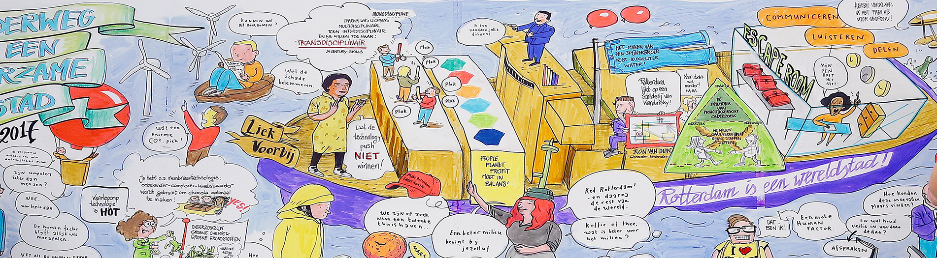 De middag begon met een ludieke kick-off met Jurgen van Groningen Schinkel, waarbij het publiek door middel van plastic buizen uiteindelijk een ritmisch vierakkoordenschema speelde waar het aanvankelijk alleen maar losse noten kon produceren. Directeur Kenniscentrum Duurzame HavenStad, Liek Voorbij, haakte in op de muzikale prestaties door het te vergelijke met monodisciplinair, multidisciplinair, interdisciplinair en uiteindelijk transdisciplinair (samen)werken. Want daar moet het naartoe, vertelde zij.