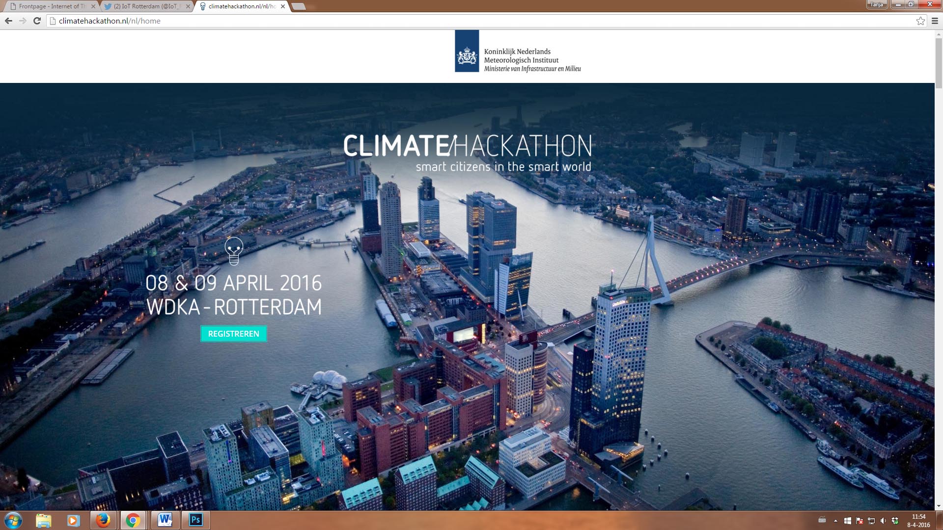Rotterdam vindt plaats op vrijdag 8 en zaterdag 9 april aan de Wijnhaven 61 (Willem de Kooning Academie) en 107 (Instituut voor Communicatie, Media en Informatietechnologie). Gerenommeerde experts laten hun licht schijnen over aspecten van IoT in lezingen en workshops. Studenten presenteren hun werk. Op vrijdag is de aftrap van een 24-uurs Climate Hackathon waarvan de resultaten op zaterdagmiddag worden gepresenteerd.
