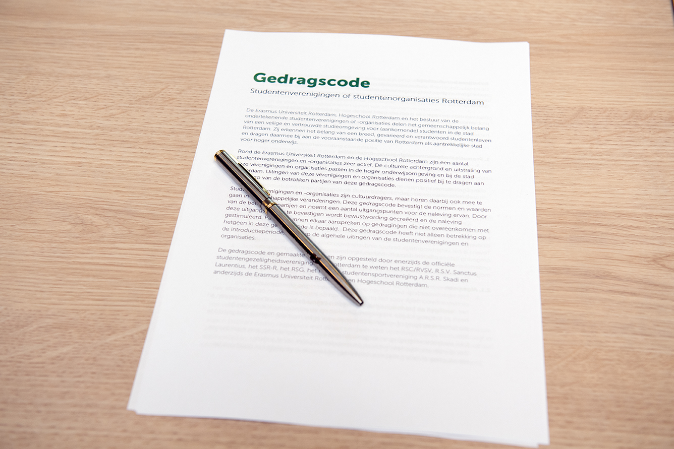 De gedragscode werd vandaag op een locatie van Hogeschool Rotterdam ondertekend door rector magnificus prof.dr. Rutger Engels (EUR), collegevoorzitter Ron Bormans (HR), praeses Saskia Dusseljee (Rotterdamse Kamer van Verenigingen) en de zes verenigingen. Met de ondertekening onderstrepen alle partijen het gemeenschappelijke belang van een veilige en vertrouwde studieomgeving voor (aankomende) studenten in Rotterdam.