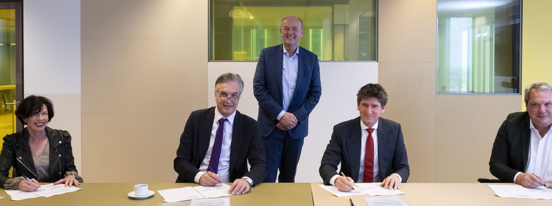 Bestuurders Alice Vlaanderen (Directie Sport, Onderwijs en Cultuur gemeente Rotterdam), Wijnand van den Brink (Hogeschool Rotterdam), Bob de Baedts (St. BOOR) en Carlo Schreuder (Gemeente Rotterdam Stadsontwikkeling) ondertekenen de overeenkomst. (foto: Levien Willemse)