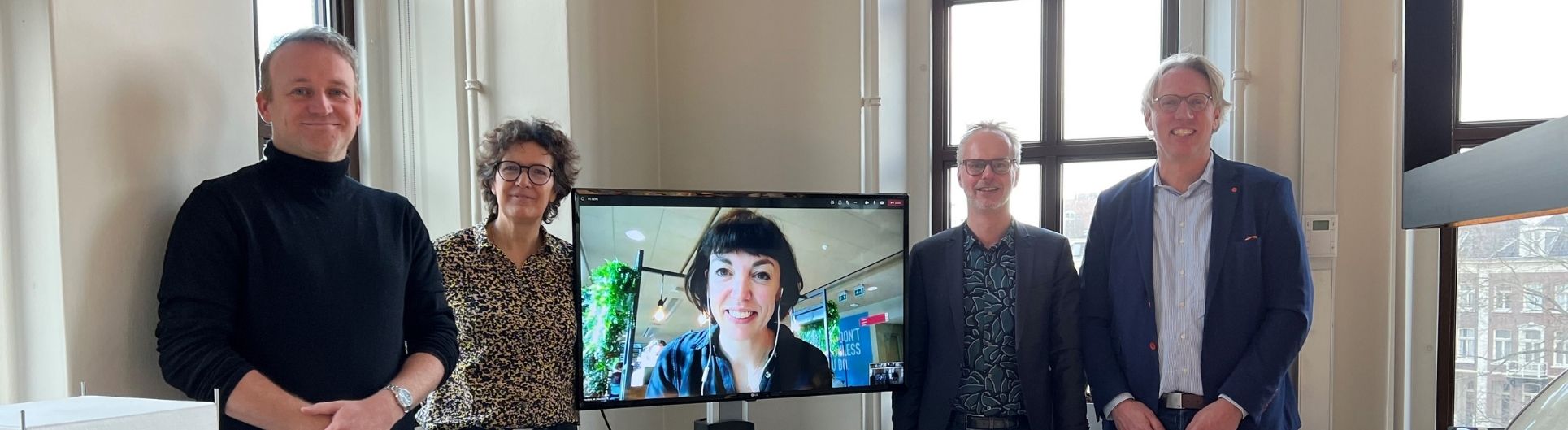 V.l.n.r. Stefan Leijnen (HU), Nanda Piersma (HvA), Maaike Harbers (HR), Frank Kresin (HvA) en Arjan Lagendaal (HR) tijdens de bijeenkomst op 7 februari.