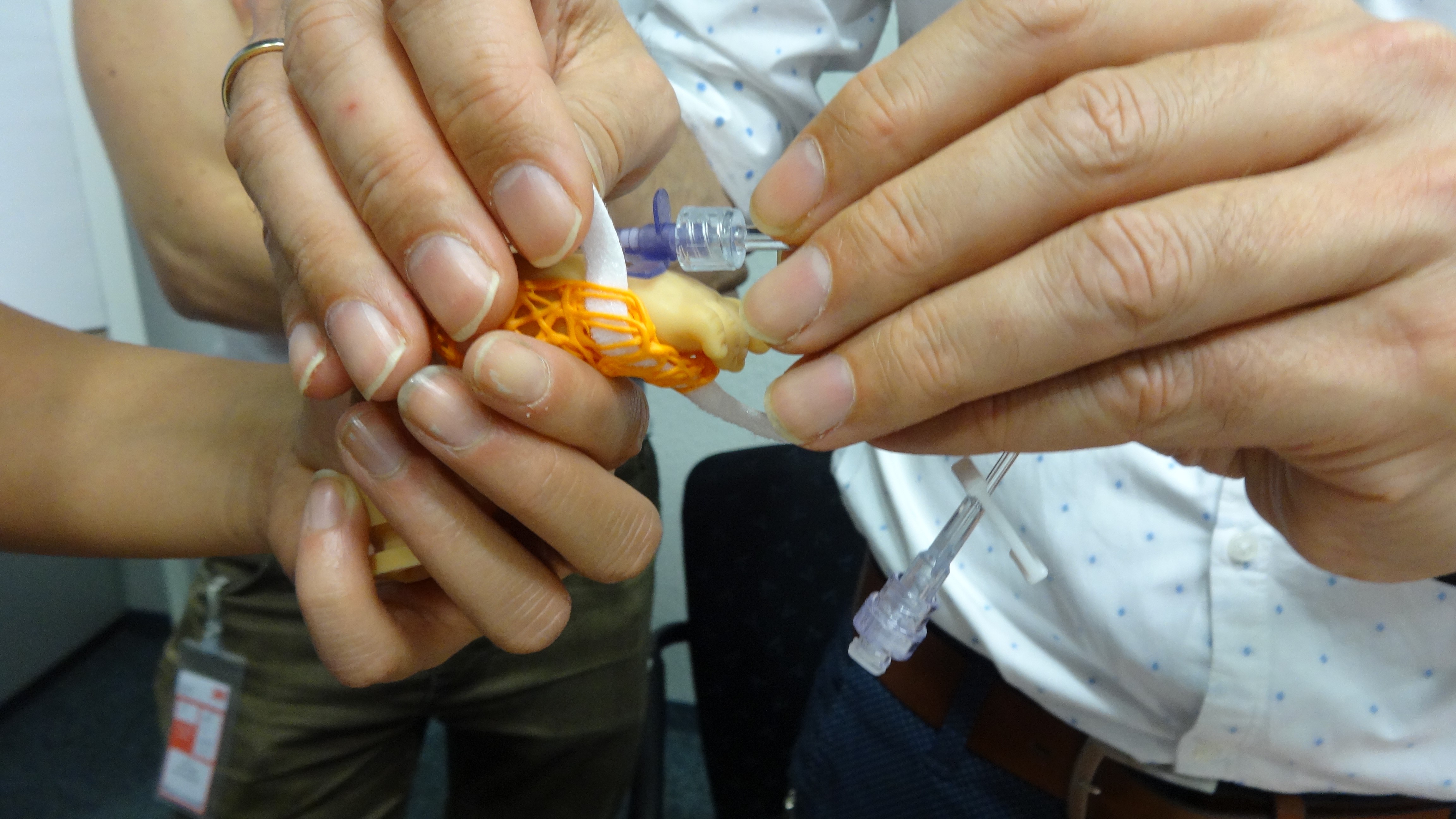 De volgende ochtend is gewerkt aan mogelijke prototypes voor een spalk. De kennis van de verschillende mensen werkte daarbij zeer stimulerend. Met de meegebrachte 3D-printer konden ideeën meteen worden omgezet in modellen en worden getest op een kleine pop. Onno Helder: “We kijken terug op een zeer geslaagde werkbezoek aan 3M. In een andere zeer professionele omgeving intensief samenwerken werkt als een snelkookpan voor goede ideeën.”