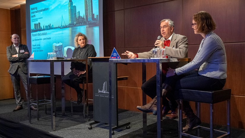 Naast Elspeth Jones bogen Robert Coelen, lector internationalisering van Stenden Hogeschool en Adinda van Gaalen van Nuffic zich over vragen als bovenstaande bij de afsluitende discussie. “Begin klein”, is het advies. “Veel opleidingen denken dat ze niet aan internationalisering doen, omdat het die naam niet heeft.”, zegt Jones. “En communiceer. Herhaal je boodschap, zo bereik je steeds meer collega’s. Maak het ook persoonlijk, schets praktijkvoorbeelden en ga de dialoog aan, vooral interdisciplinair.”