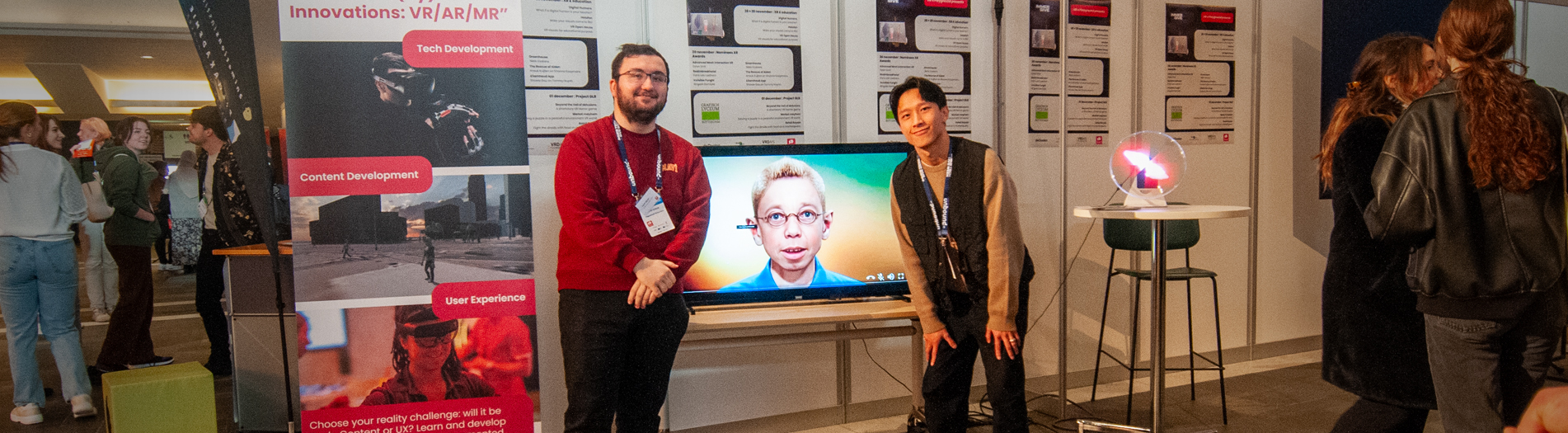 Vooral de oudere bezoekers van de Immersive Tech Week herkennen het gezicht van Bart de Graaff direct bij stand van de minor Digital Humans. Maar ook studenten Fatih Hijnen (links op de foto) en Steven Liew weten inmiddels alles over de aan een nierziekte overleden tv-persoonlijkheid. Vanuit BNNVARA hebben ze de opdracht gekregen om Bart de Graaff weer tot leven te wekken in de vorm van een digitaal mens.