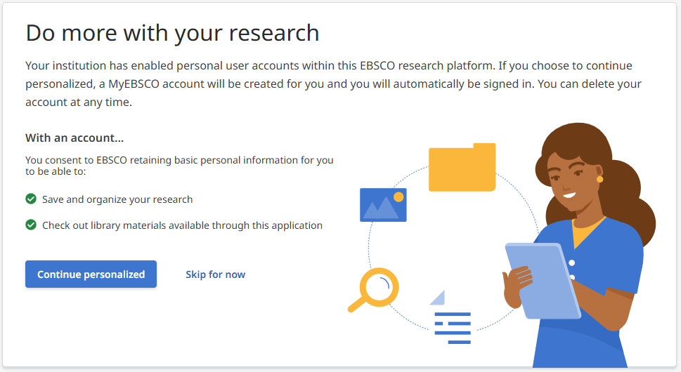Nieuwe login methode voor EBSCO databanken maak automatisch een myEBSCO account 04 december 2025 Persoonlijk account Bij de eerste keer inloggen word je gevraagd of je een persoonlijk account wil. Home Over de hogeschool Nieuws Deel deze pagina Deel op LinkedIn Deel op Twitter Deel op Facebook Email deze pagina Print deze pagina