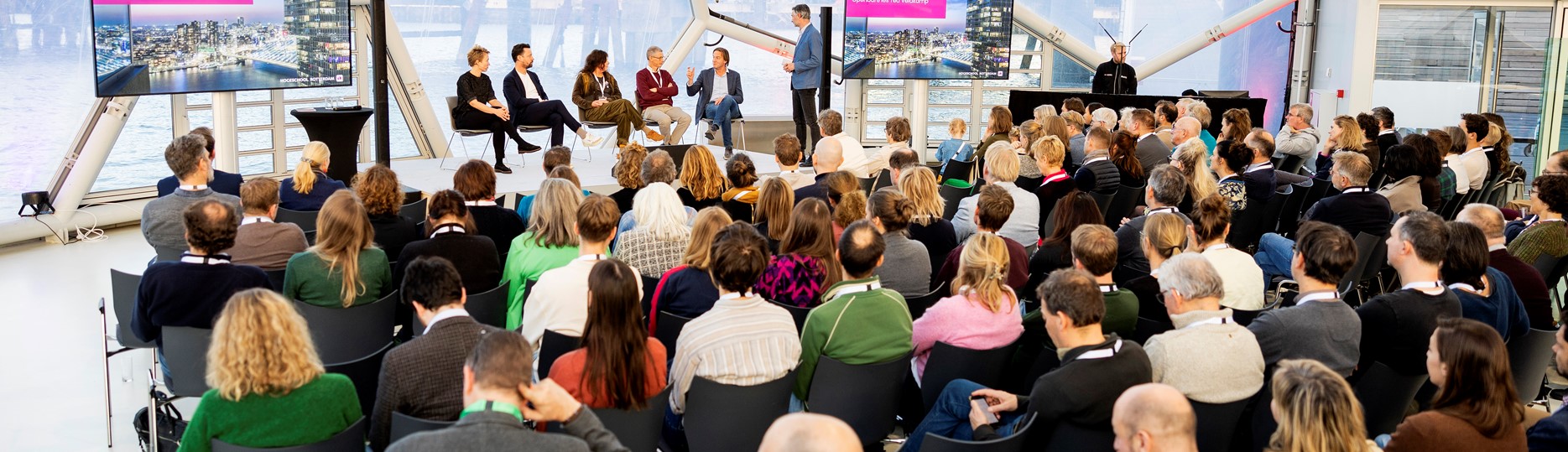 Volgende onderdeel van het programma op het Drijvend Paviljoen? De vragen van dagvoorzitter Rutger Hogezand (onderwijsmanager Watermanagement) aan een zorgvuldig samengesteld panel. Naast Veldkamp waren dat onder anderen Johan Verlinde (Gemeente Rotterdam), Ellen van Bodegom (Stichting Iedereen aan Boord), Bart van den Hurk (Deltares) en Robert van Roijen (VP Delta).