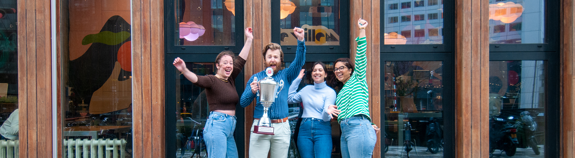 Teddy Quatfass, Julia Zwart en Tessa Bosman lopen de trap van de Willem de Kooning Academie op. “Zou hij iets in de gaten hebben”, vragen de derdejaarsstudenten Leisure & Events Management zich af. Ze hebben de enorme wisselbeker voor de Docent van het Jaar bij zich, want hun docent David de Prez is in de prijzen gevallen. “Het staat op zijn bucketlist”, lacht Julia. “En als ik een vraag stel, zegt hij altijd voor de grap dat ik hem dan wel moet nomineren voor de verkiezing Docent van het Jaar”, zegt Tessa.