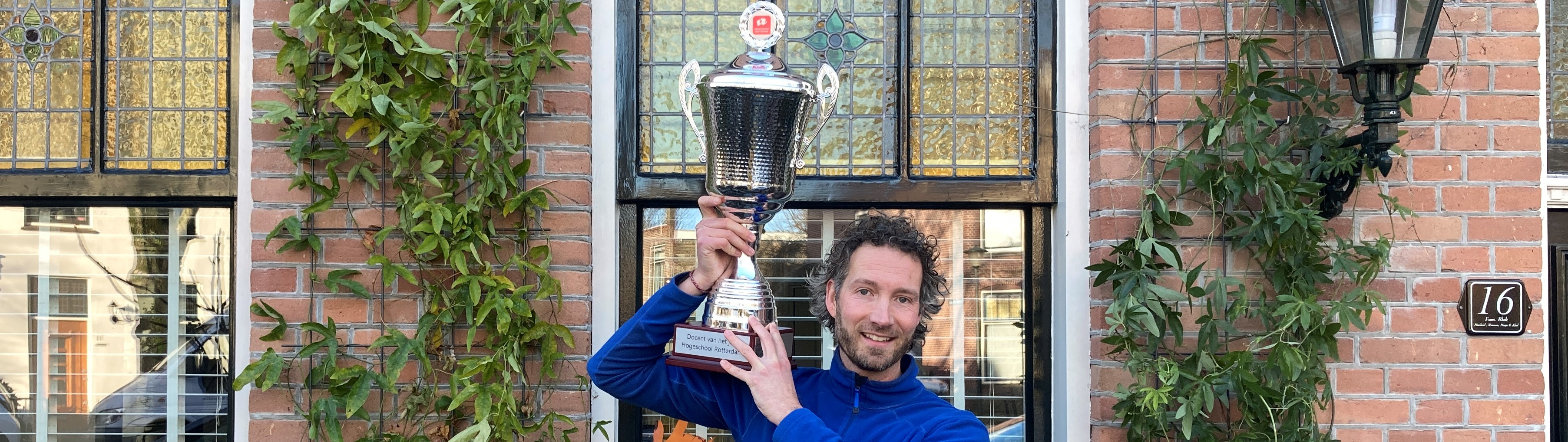 Na het in ontvangst nemen van de prijs ging Machiel weer naar zolder, waar zijn studenten en collega’s nog steeds in het Teams-gesprek zaten. Net als bestuurslid Zakia Guernina, die mooie woorden voor hem over had. “Wat bij jou opvalt is dat je ook het online onderwijs met passie en enthousiasme kan overbrengen. Je hebt hart voor didactiek en pedagogiek, ook in deze tijden waarin we via een beeldscherm met elkaar communiceren. Ik vind het hartstikke mooi om hier in dit scherm veel studenten van jou te zien en te horen hoe blij ze met jou zijn. Als Hogeschool Rotterdam zijn we er trots op dat jij bij ons werkt.”