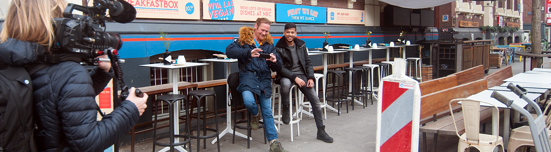 Angad Pabarni is de eerste student (tweedejaars Social Work) die op de foto is gezet door 'Caveman010'. Hij koos voor de Witte de Withstraat. "Het bruist hier altijd", zegt hij op het terras van NRC. "Ik ga hier vaak met vrienden naartoe, een heerlijke plek. Vanuit mijn opleiding richt ik me op welzijn en samenleving. Nou, alles wat je kunt tegenkomen in de samenleving zie je op de Witte de With."