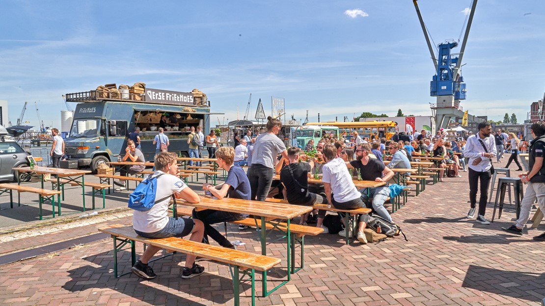Terwijl Myrthe in de onderzeebootloods haar verhaal vertelt aan nieuwsgierige bezoekers, genieten anderen buiten van de zon, foodtrucks, silent disco en het uitzicht op de Maas. “Het is écht een festival”, zegt Myrthe. “Dat trekt mensen aan die in eerste instantie niet voor de techniek komen, maar er wel in geïnteresseerd kunnen raken.”