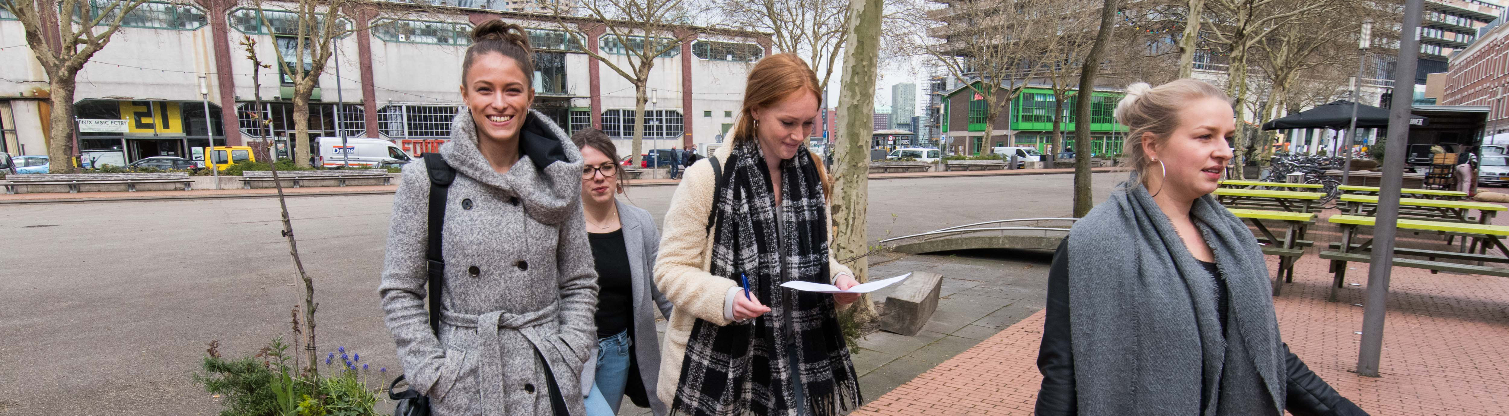 Dus wilde hij de bezoekers van zijn openbare les gelijk laten kijken, horen en proeven in de wijk. Laura van Berkel, Anne van Iersel, Daphne Pap en Mirthe Meijaard (allen studenten Verpleegkunde) gingen als groepje op pad op Katendrecht. Anne scant alvast de vragenlijst. Wat is jullie indruk van de wijk? Zijn er speeltuinen voor kinderen? Hoeveel bomen staan er?