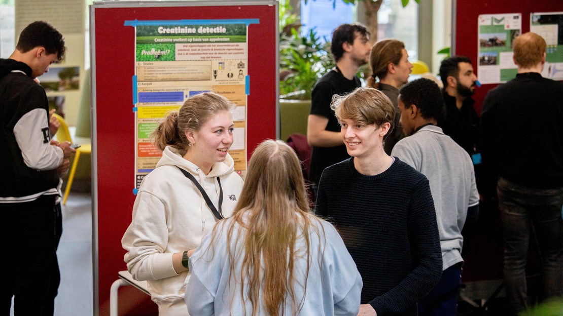 Mirjam van den Bosch, directeur EAS, heeft hierbij een prijs uitgereikt. Een jury met docenten uit verschillende disciplines hadden onder andere de volgende criteria: Wie kan mij het beste het project uitleggen? Welke groep geeft het project het beste visueel weer en begrijp ik zo de onderzoeksvraag en de tot nu toe behaalde resultaten? Welke groep kan het beste vertellen met welke disciplines ze samenwerken en wie hebben ze nog nodig? Er waren meerdere projecten die hieraan voldeden, maar de uiteindelijke winnaar van een bezoek aan de bioscoop is het team van het project ‘Motion Sensors’ van de Elektrotechniek studenten Younes Boulmani, Linda Hoogerwerf en Daan van Veldhoven.