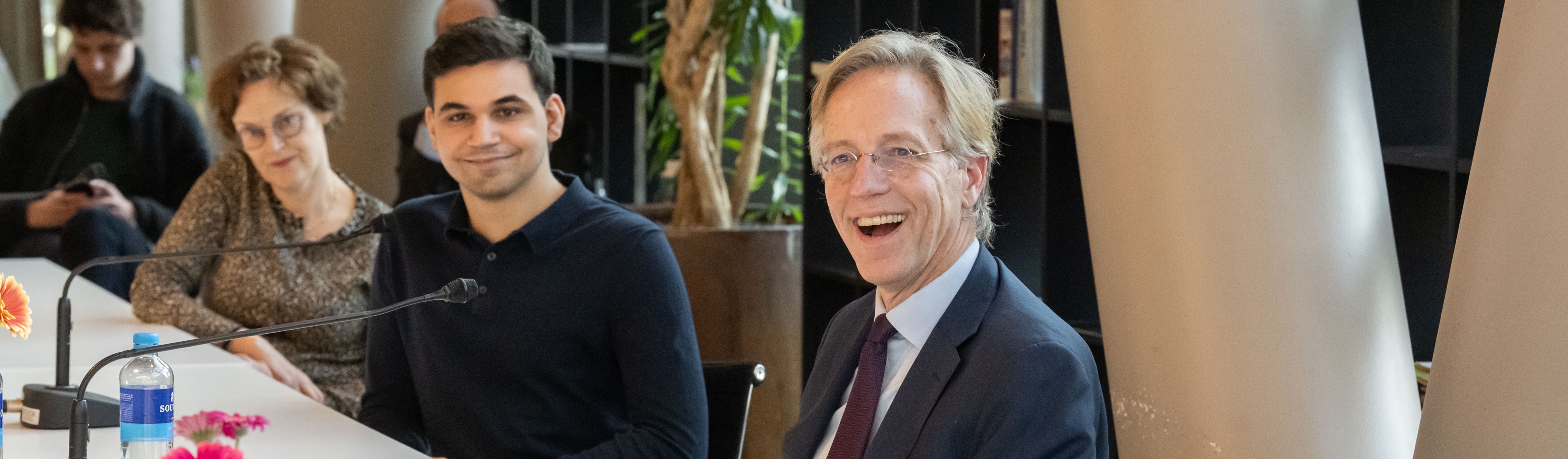 Minister Dijkgraaf knikt instemmend. “Blij te horen dat jullie dit ook zonder mij af kunnen”, zegt hij lachend. “Ik dacht al dat ik overbodig was, maar dat is bij deze bevestigd.” Daarna weer serieus: “De les die de wereld de afgelopen twee jaar heeft geleerd is dat het onderwijs op één moet staan. Het liefst wil je in het onderwijs af van een aan/uit-knop bij de ingang, die in relatie staat met het coronavirus, maar dat je wel in staat bent om een dimknop te gebruiken als dat nodig is. Dat brengt me trouwens bij mijn boodschap aan studenten. Door corona is het een gekke tijd om te studeren, maar daardoor heb je wel een voorsprong opgebouwd. Jullie hebben leren omgaan met deze situatie. Succes met alles wat jullie aan het doen zijn en met wat jullie allemaal nog gáán doen.”
