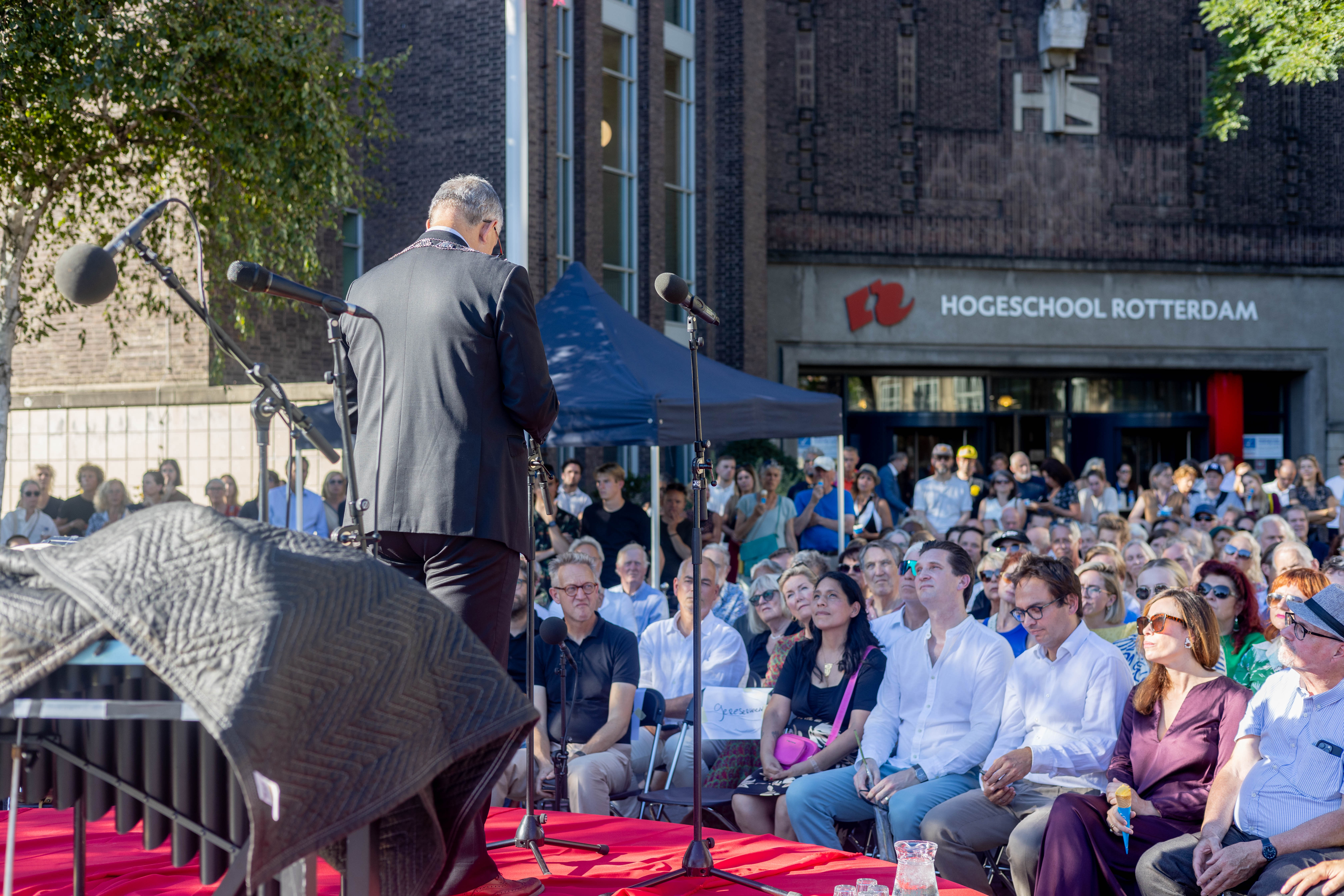 Het ontwerp van Anne-Mercedes, waaraan ook kunstenaar Han Goan Lim meewerkte, is geïnspireerd op het Grand Theatre dat aan de pompenburgsingel stond. Dit was het paradepaardje van de stad en tevens de grootste bioscoop van Nederland. Naast een bioscoop was het ook een podium waar optredens plaatsvonden en waar Rotterdammers geëerd werden wanneer zij iets bijzonders hadden gedaan. Daarmee maakte Tuschinski iedereen belangrijk. Daarom koos Anne-Mercedes voor een podium waar je ook daadwerkelijk op kunt staan of zitten, met de uitstraling van dit chique theater. In de rand van het podium staat een bekend citaat van Tuschinski: ‘Niets is onmogelijk!’. Het is de bedoeling dat het podium mensen bij elkaar brengt en verbindt. Hoe mooi zou het daarom zijn als wij hier straks als Hogeschool Rotterdam samen met de stad het podium kunnen pakken om onze studenten, collega’s en andere geïnteresseerden te inspireren?