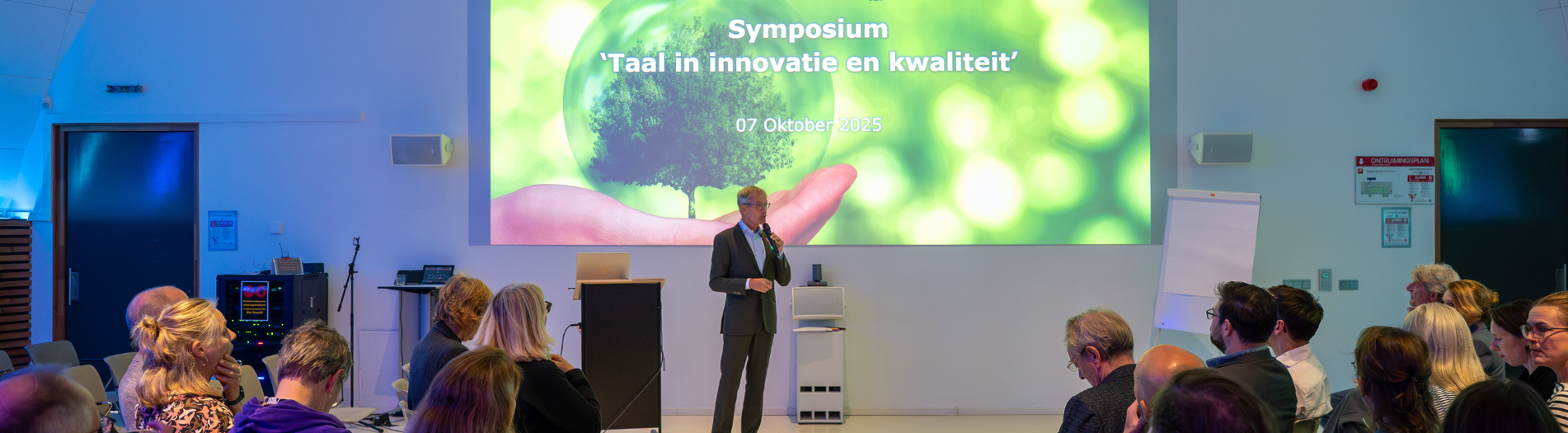 Arjen van Klink, directeur bij Kenniscentrum Business Innovation en lector Next Strategy bij Hogeschool Rotterdam, opende het symposium. Hij benadrukte dat taal de basis vormt van kennisontwikkeling en samenwerking.