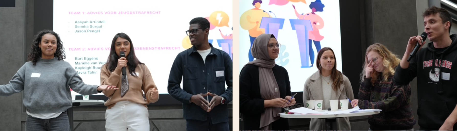 Om het publiek en de studenten meer inzicht in het onderwerp te geven, verzorgden twee sprekers een inleiding. Jolande uit Beijerse, hoogleraar justitiële jeugdinterventies aan de Erasmus Universiteit Rotterdam, sprak over het ontstaan van het jeugdstrafrecht en de huidige vormgeving ervan In (inter)inationaal perspectief. Evelien Vlassenrood, gedragswetenschapper bij JBRR, gaf vervolgens inzicht in het adolescentenstrafrecht en schetste hoe gedragswetenschappers een casus beoordelen en tot een strafadvies komen.