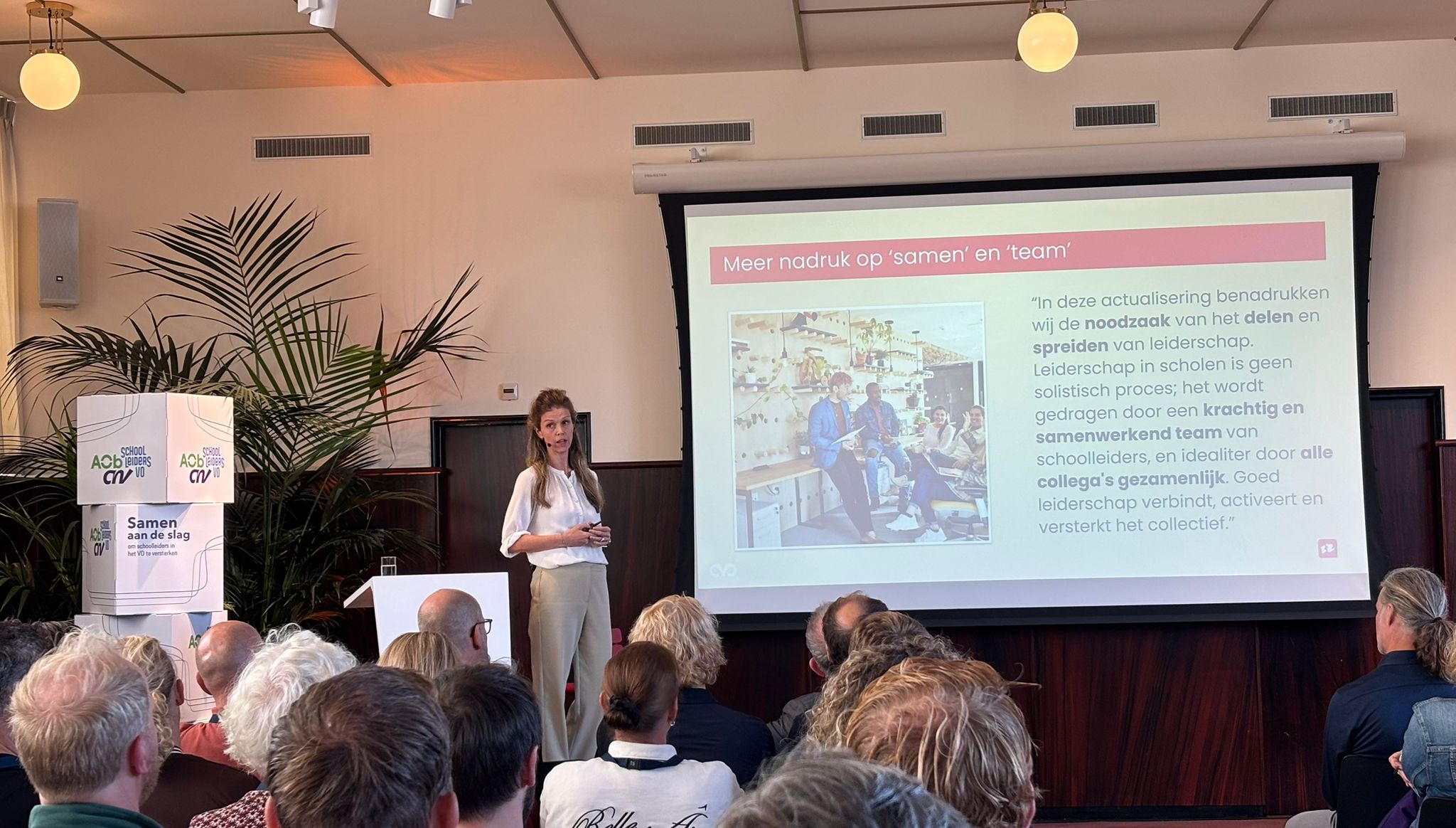 Op woensdag 1 oktober verzorgde Annemarie de keynote op de werkconferentie 'Van visie naar vakmanschap; leidinggeven aan kwaliteit'. Op dit uitverkochte event, waar meer dan 150 schoolleiders bijeenkwamen, sprak zij over het belang van gespreid én gedeeld leiderschap voor duurzame onderwijsontwikkeling. Daarnaast nam zij de deelnemers mee in nieuwe onderdelen van de Beroepsstandaard Schoolleiders VO, waaronder rubrics van een aantal leiderschapspraktijken. Dit zijn groeimodellen die het professionele handelen beschrijven in vier opeenvolgende ontwikkelfasen. Deze fasen lopen van de startpraktijk van een beginnend teamleider tot de praktijk van een ervaren, richtinggevend eindverantwoordelijk schoolleider. De rubrics bieden schoolleiders inzicht in hun ontwikkelpad en aanknopingspunten voor reflectie, feedback en dialoog binnen de schoolleiding en daarbuiten.