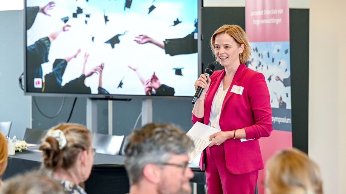 Op deze middag verzorgden dr. Lia Voerman en dr. Jarise Kaskens, beiden lector Didactiek van hoge verwachtingen, gezamenlijk de keynote. Voor wie een opfrisser nodig had, introduceerde Lia het principe van hoge verwachtingen. Ze stelde de zaal de vraag: ‘wie is er vroeger vaker dan tien keer de zaal uitgestuurd?’. Op de vervolgvraag ‘wat deden docenten bij wie je juist niet de klas uitgestuurd werd?’, antwoordde een deelnemer: “Die zorgden ervoor dat er ook ruimte was om plezier te maken”. Lia gebruikte dat als een bruggetje om te benadrukken dat hoge verwachtingen beginnen bij studenten zien als mens en niet als lerende. Vriendelijk zijn, feedback geven, niet te veel instructies geven en vragen stellen zijn de principes waarop de didactiek gestoeld is.