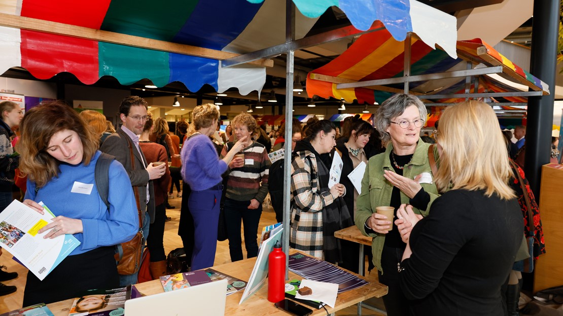 Tijdens de inloop en de maaltijd was er een markt waar deelnemers zich konden laten informeren over de activiteiten en publicaties van onder andere ZangExpress, Bukiboek, Expertisecentrum Basisvaardigheden, Uitgeverij Tutti, Mama’s Garden & Daddy’s Place, Gelijke Kansen Alliantie, BookaBooka, Gekletter, CED-groep, Gereedschapskist Beter Samenwerken met Ouders, Nik-nak, Mywingzzz.com en Lappa Books. De kraampjes werden druk bezocht en er werden gesprekken gevoerd over het belang van het ondersteunen bij meertaligheid. De materialen van de Gereedschapskist van Kenniscentrum Talentontwikkeling waren al na korte tijd niet meer voorradig omdat ze zo populair waren bij de aanwezigen.