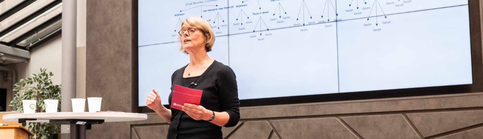 Na een workshopronde, waarin vier workshops worden gegeven over verschillende onderzoeken die vanuit het lectoraat zijn gedaan en nog steeds lopen, komt Ostara de Jager-Bes aan het woord. Zij is directeur van het Instituut voor Sociale Opleidingen en vertelt hoe het lectoraat bijdraagt aan de opleiding Social Work. "Armoede is een zeer belangrijk thema voor de sociale opleidingen en voor de stad Rotterdam. Onze onderzoeksagenda is daarom verbonden met het lectoraat Kinderarmoede. We willen de professionals die we opleiden een handelingsperspectief meegeven.”