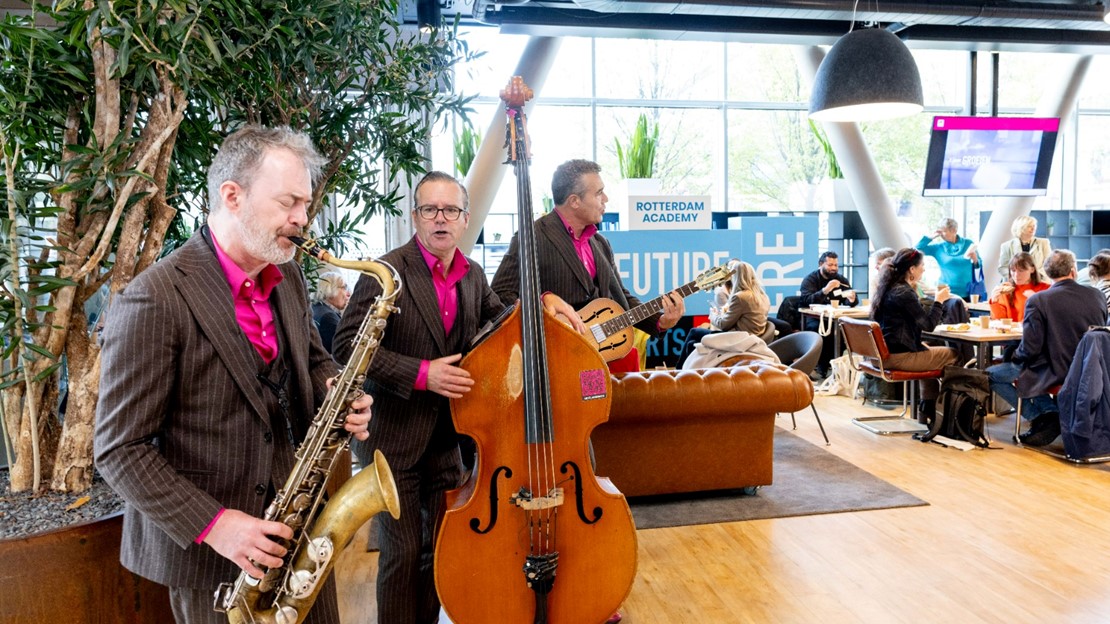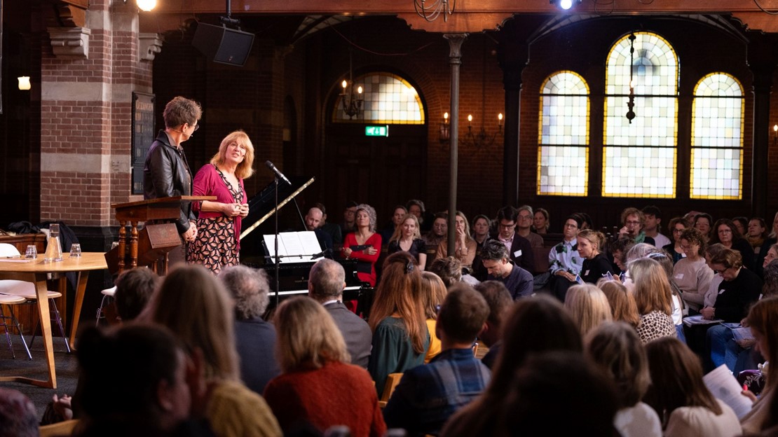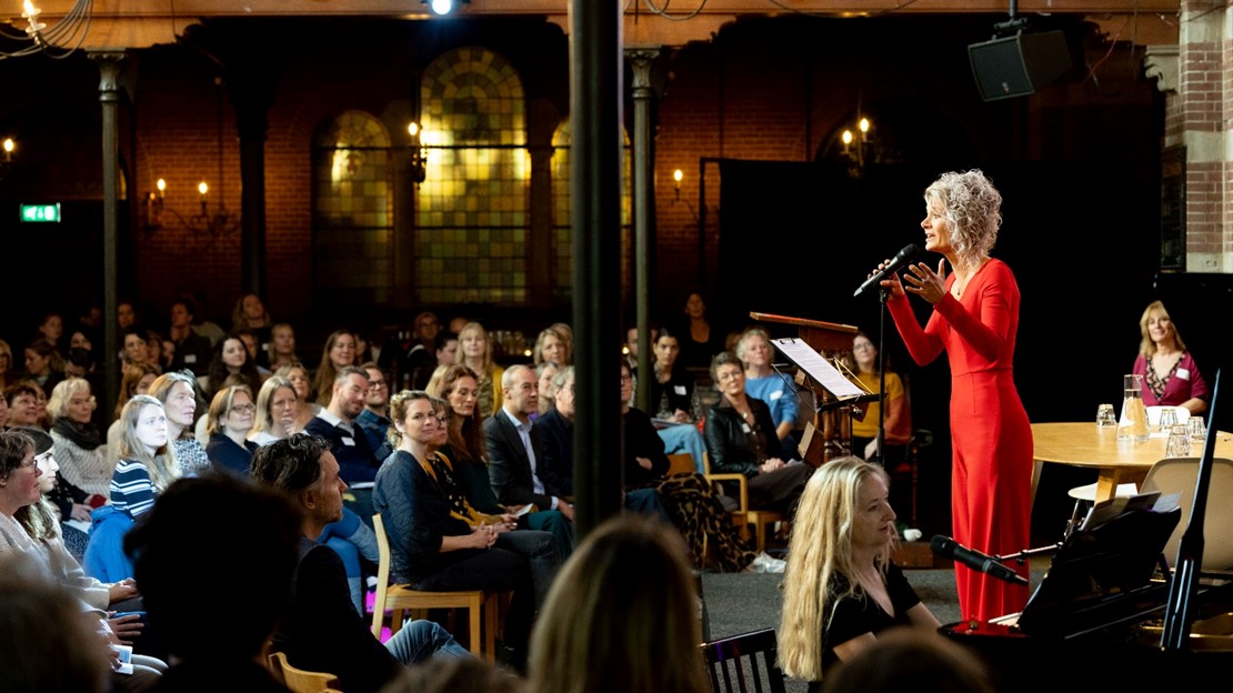 In het afsluitende lied pakte Hanneke Drenth de taalontwikkeling van kleuter tot hogeschooldocent samen in een herkenbaar lied, dat tegelijkertijd een eerbetoon vormde aan de Rotterdamse dichter Jules Deelder.