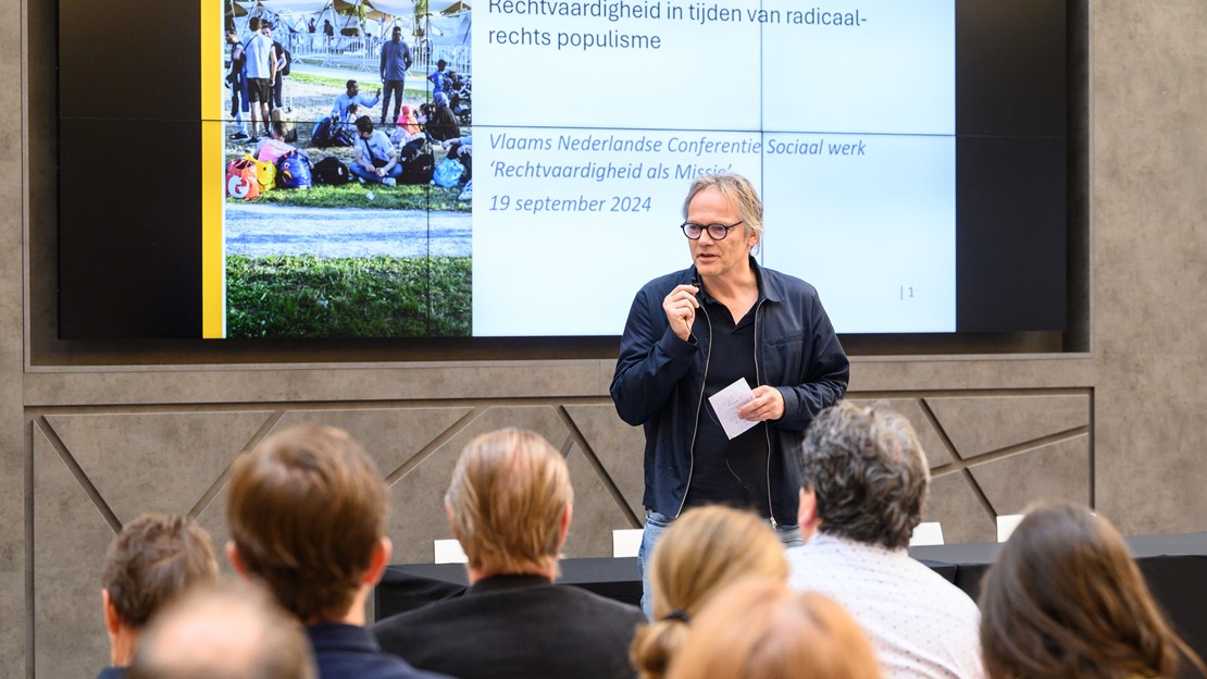 De eerste conferentiedag begon met de keynote 'Sociaal werk in morele nood? Rechtvaardigheid in tijden van radicaal-rechts populisme' van Thomas Kampen, hoogleraar Sociaal Werk aan de Universiteit voor Humanistiek. Hij besprak hoe situaties die botsen met de kernwaarden van het beroep leiden tot ‘gespleten loyaliteit’. Hoe ga je als sociaal werker om met het uitvoeren van beleid dat haaks staat op je morele of persoonlijke overtuigingen? Blijf je loyaal aan de organisatie, opdrachtgever, je cliënt of het beroep? En hoe blijf je ondanks de spanningen je werk zo goed mogelijk doen?