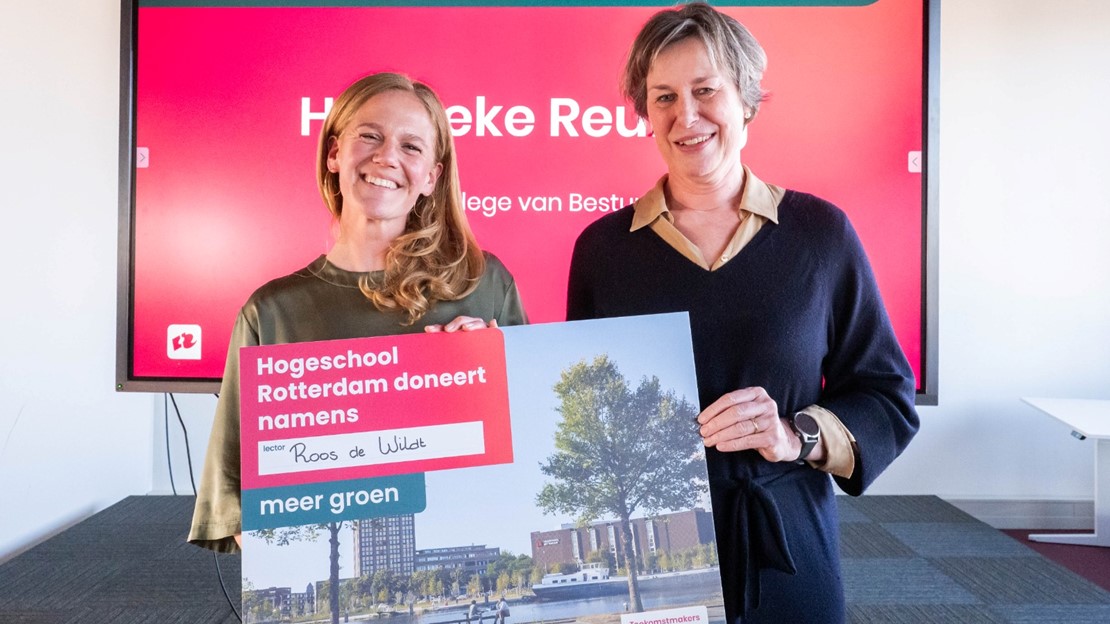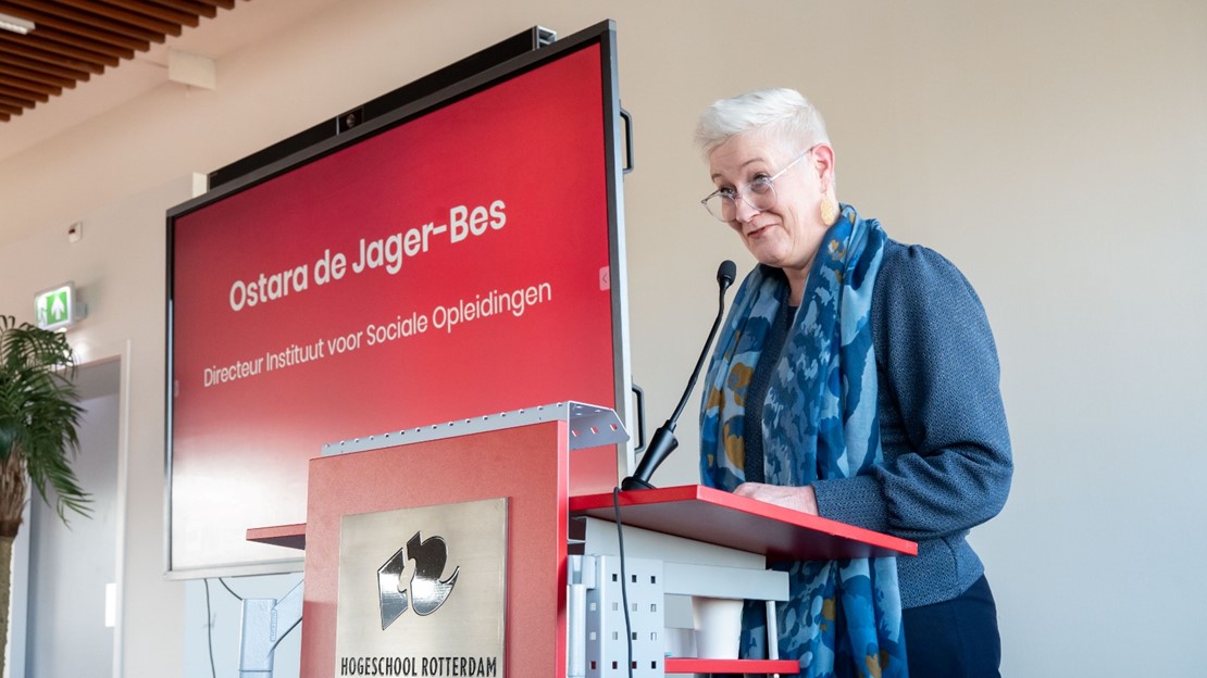 Tijdens de officiële installatie, benoemt CvB-lid Hanneke Reuling het belang van effectief beschermen in Rotterdam en de integrale aanpak daarbij. Roos heeft volgens Hanneke drie eigenschappen die een goede basis zijn voor de nodige samenwerking: verbinding, nieuwsgierigheid en praktisch optimisme. “Je hebt een indrukwekkend netwerk binnen zowel de praktijk als het onderwijs en hoe je kennis hierin verbindt. Je bent een levend voorbeeld van hoe je samen sterker staat. Jouw lectoraat doet ertoe en draagt bij aan verbetering.” Als allerlaatste heeft Hanneke een algemene opmerking over lectoren binnen Hogeschool Rotterdam: “Lectoren zien we als de boegbeelden die altijd gericht zijn op maatschappelijke opgaven. Zij zijn de dragers van onze kennisinstelling”.