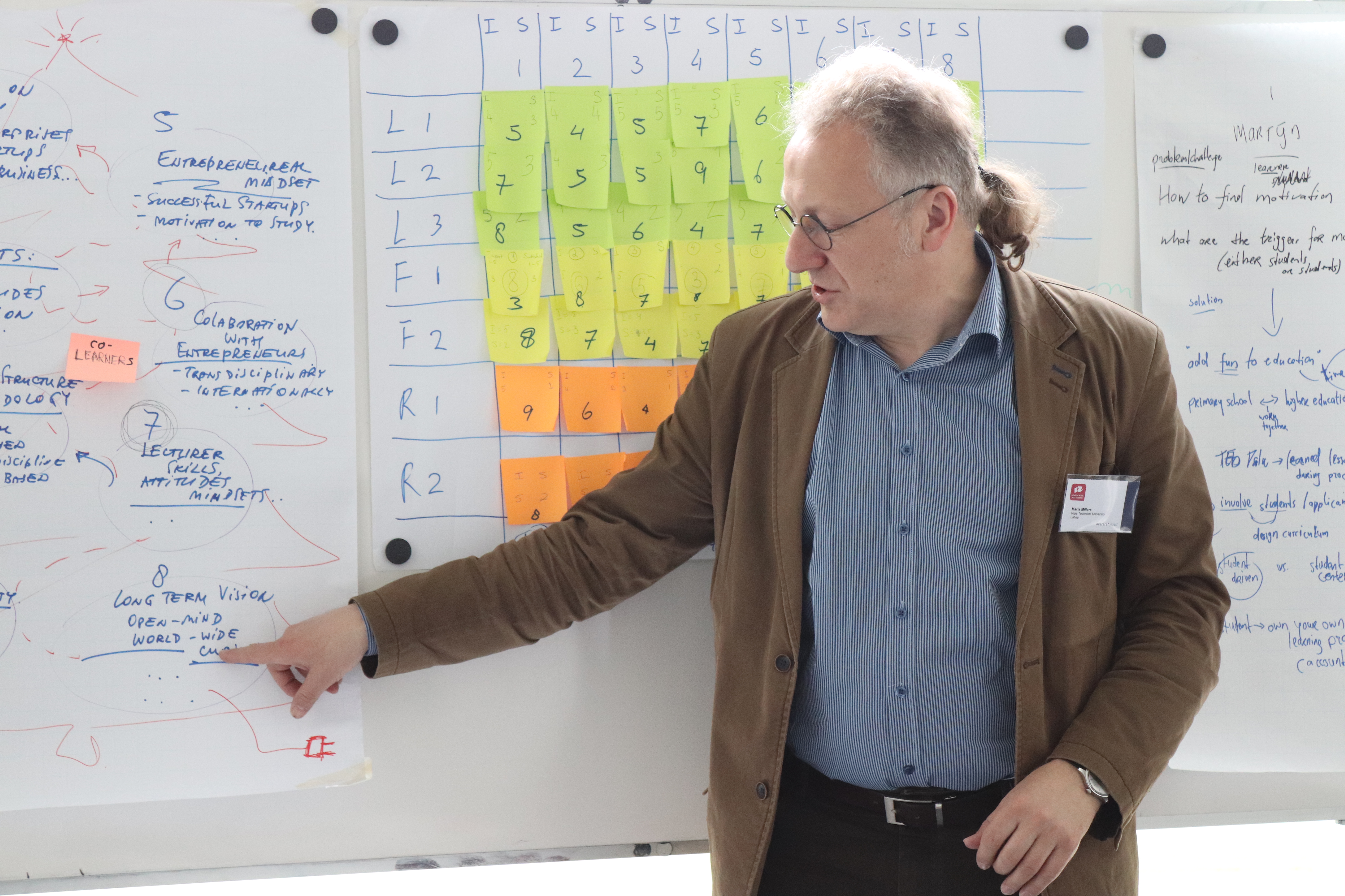 Tijdens de eerste sessie hebben de deelnemers in kaart gebracht wat ieders verwachtingen zijn met ondernemerschapsonderwijs en of er een 'common ground' is om gezamenlijk meerwaarde te creëren. Nadat deze gezamenlijke doelen in kaart waren gebracht, is er aan de slag gegaan met de 'ideation'; mogelijke oplossingen of ideeën verzamelen die helpen de doelen te bereiken. Tot slot zijn de eerste, enigzins abstracte, ideeën in concretere experimenten omgezet zodat ze in de praktijk getest kunnen worden. De ontstane ideeën worden verwerkt in een model dat het uitgangspunt voor de verdere ontwikkeling van de methodologie zal zijn. Hier zal nog verder aan worden gewerkt en op voort worden gebouwd.