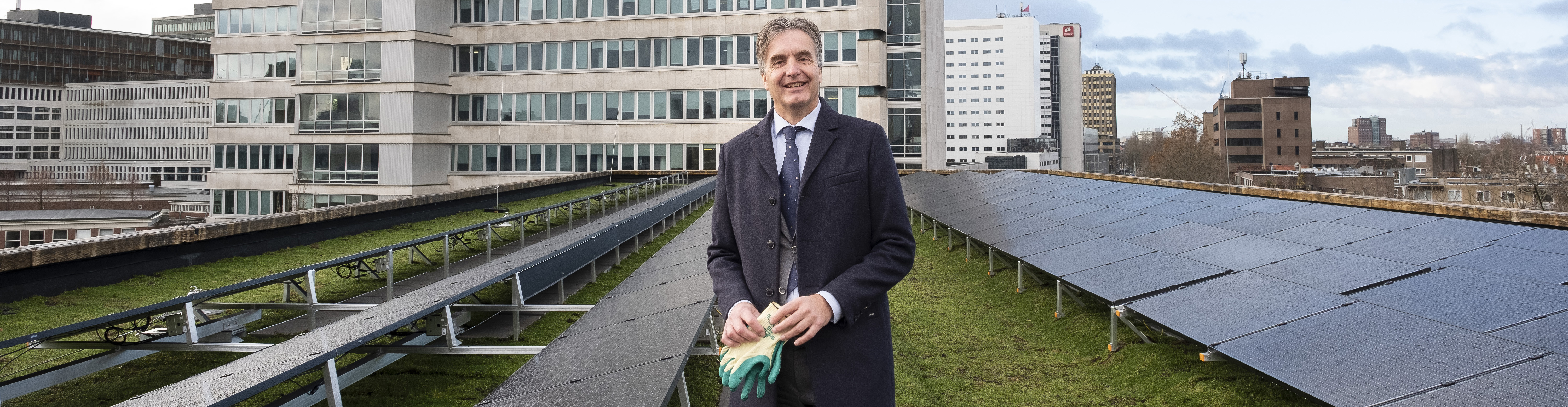 “Als je hier op locatie Museumpark komt binnenlopen, zie je een scherm hangen waarop is te zien hoeveel elektriciteit onze 661 zonnepanelen op het dak opwekken. Die elektriciteit wordt gelijk in het pand gebruikt, bijvoorbeeld op plekken waar studenten hun laptop en telefoon opladen. Onder de zonnepanelen is een daktuin aangelegd, waarmee we regenwater kunnen opvangen en het niet naar het overbelaste riool van Rotterdam stroomt. Op die manier kan iedereen zien op welke manier wij met duurzaamheid bezig zijn en goed proberen om te gaan met onze planeet. Daar hebben wij als hogeschool een belangrijke rol in. Wij voeden mensen op, ook op dit gebied. En daar doet iedereen aan mee. We moeten het samen doen. Als iemand met een printje in zijn of haar hand naar het overleg van het College van Bestuur komt, krijgt ‘ie dat te horen. We hebben allemaal mobiele devices, dus een A4-tje uitdelen is overbodig. In het kader van internationalisering nemen collega’s af en toe het vliegtuig. Daarvoor hebben we nieuwe regels opgesteld. Probeer niet te vliegen, gebruik Skype of Facetime. En als je toch de grens over gaat, pak dan de trein. Naar omliggende landen is het niet langer toegestaan te vliegen. Als je toch het vliegtuig moet pakken, neem dan een directe vlucht in plaats van meerdere vluchten met tussenstops.”