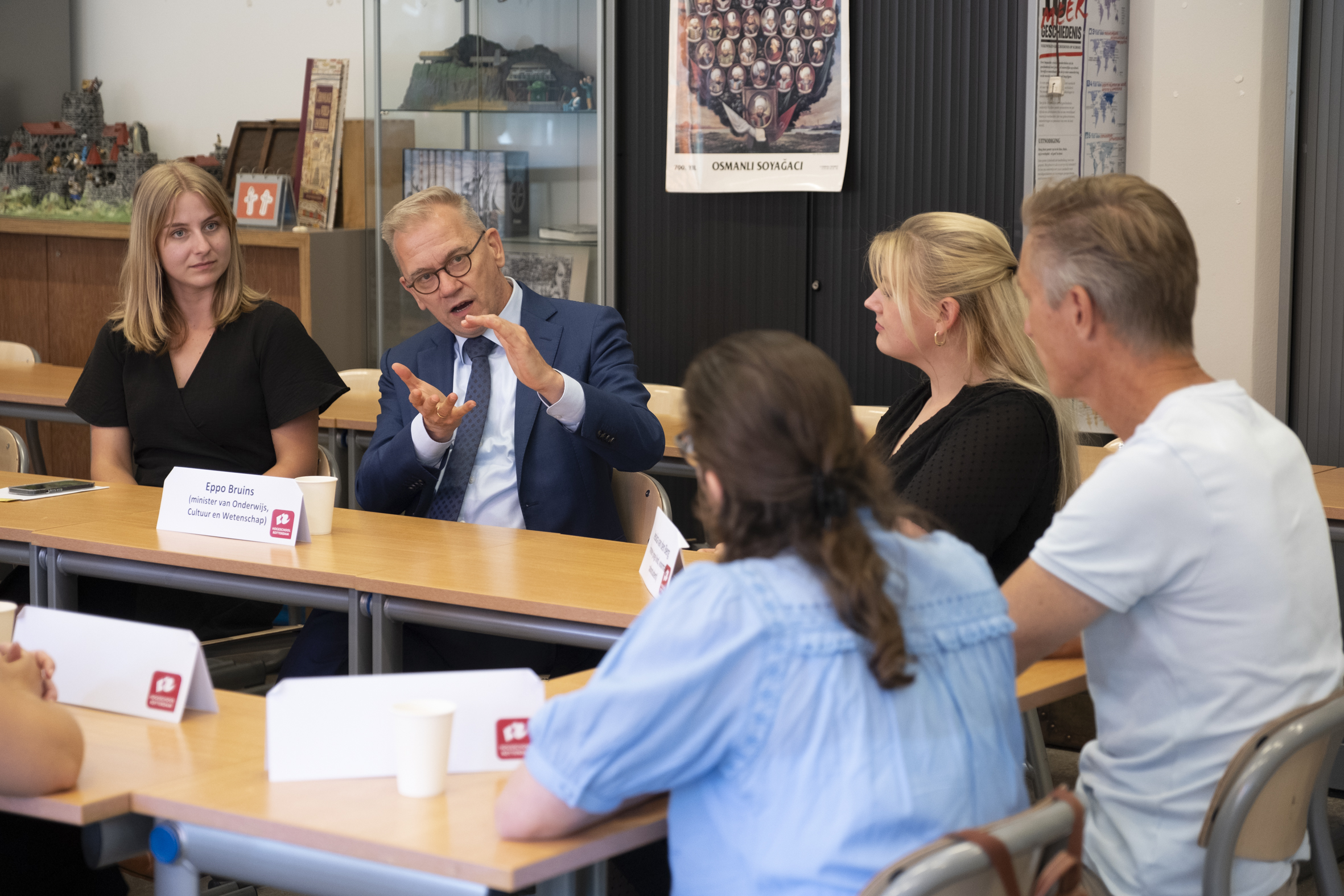 Minister Eppo Bruins van Onderwijs, Cultuur en Wetenschap in gesprek met studenten van Hogeschool Rotterdam.