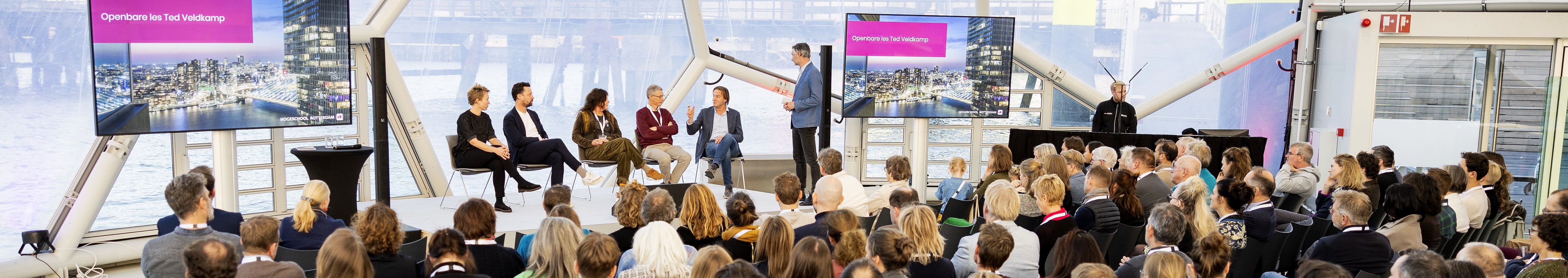 Volgende onderdeel van het programma op het Drijvend Paviljoen? De vragen van dagvoorzitter Rutger Hogezand (onderwijsmanager Watermanagement) aan een zorgvuldig samengesteld panel. Naast Veldkamp waren dat onder anderen Johan Verlinde (Gemeente Rotterdam), Ellen van Bodegom (Stichting Iedereen aan Boord), Bart van den Hurk (Deltares) en Robert van Roijen (VP Delta).