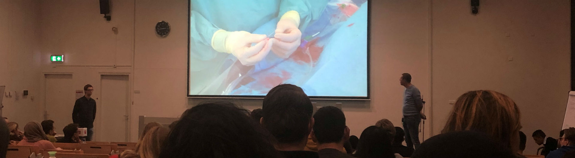 De ongeveer zestig studenten van Medische Hulpverlening (BMH) en Gezondheidszorg Technologie kijken niet naar het nieuwste seizoen van Grey’s Anatomy, nee, ze kijken live mee bij een cardiologische behandeling die in het Erasmus MC wordt uitgevoerd. Het is een interactief college, want de studenten kunnen tijdens de ingreep vragen stellen aan het team van twee interventiecardiologen, twee medisch hulpverleners en een medisch technicus.