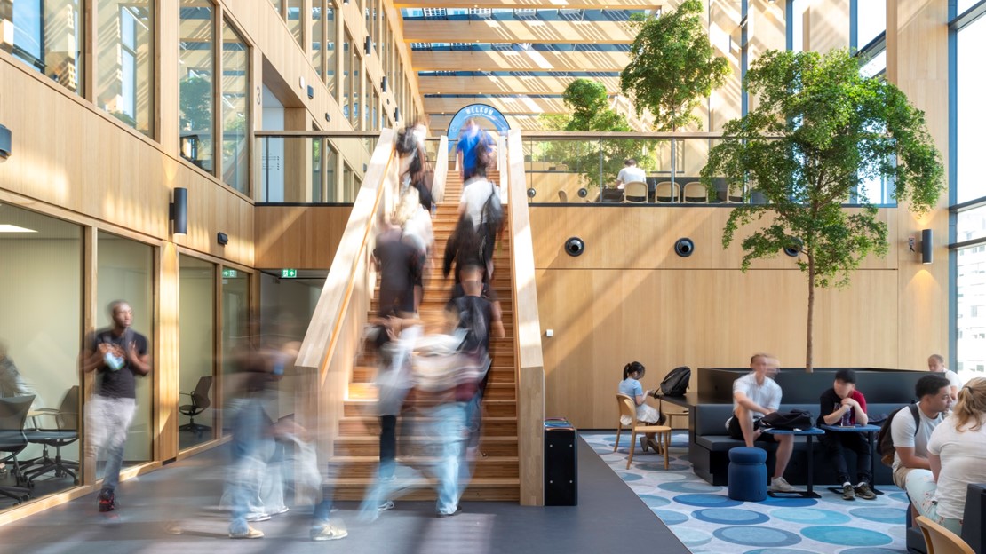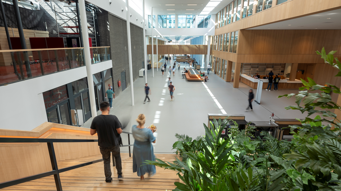 Een groot deel van de gevel en het dak van Bouwdeel C bestaat uit glas. Naast dat dit er mooi uit ziet, heeft het ook een heel praktisch nut. Er komt hierdoor namelijk enorm veel daglicht in het gebouw. Verschillende onderzoeken laten zien dat dit bijdraagt aan je natuurlijke bioritme, wat ervoor zorgt dat je makkelijker en beter kan studeren en werken. Kijk vooral ook even omhoog in het atrium: daar zie je zonnepaneeltjes in het glazen dak verwerkt. Een mooie combinatie van licht en energieopwekking, die ook nog eens prachtige mozaïekpatronen op de vloer tovert.