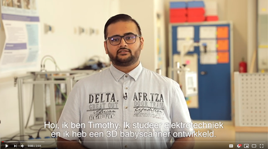 Timothy Singowikromo wint de prijs voor zijn 3D-scanner om de groei van te vroeg geboren baby’s te monitoren. Door de scanner hoeven de baby’s tijdens metingen niet meer worden aangeraakt, want veel stress scheelt bij zowel de kinderen als bij verpleegkundigen. Ook zijn de metingen nauwkeuriger en blijft de situatie hygiënisch. De jury over Timothy: “Timothy kijkt verder dan de grenzen van zijn eigen discipline. Zijn professionele doorzettingsvermogen en creativiteit in een zeer complex project met beperkte financiële middelen voor prototyping maakten diepe indruk.” Bekijk de video over de 3D-scanner.