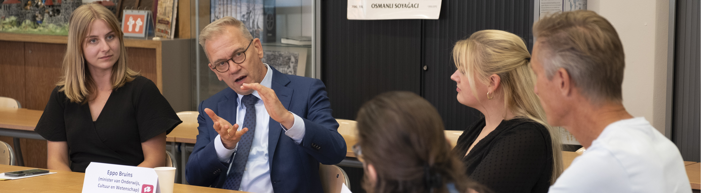 Minister Eppo Bruins van Onderwijs, Cultuur en Wetenschap in gesprek met studenten van Hogeschool Rotterdam.