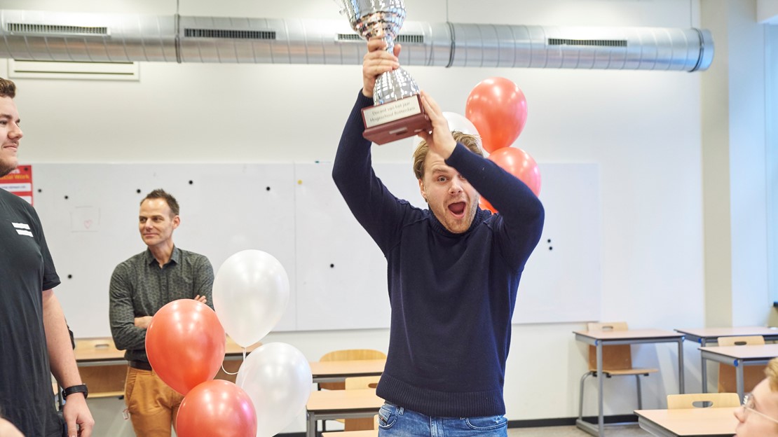“Ongelooflijk, dit had ik totaal niet verwacht”, aldus de docent, die aan het begin van dit jaar nog in de jeugdzorg werkte. “Ik ben hier pas sinds april en sta nu al met deze prachtige prijs in mijn handen. Dat is mede te danken aan de geweldige studenten uit mijn klas en de hulp die ik van collega’s krijg. Op naar nog heel veel mooie jaren op Hogeschool Rotterdam!”