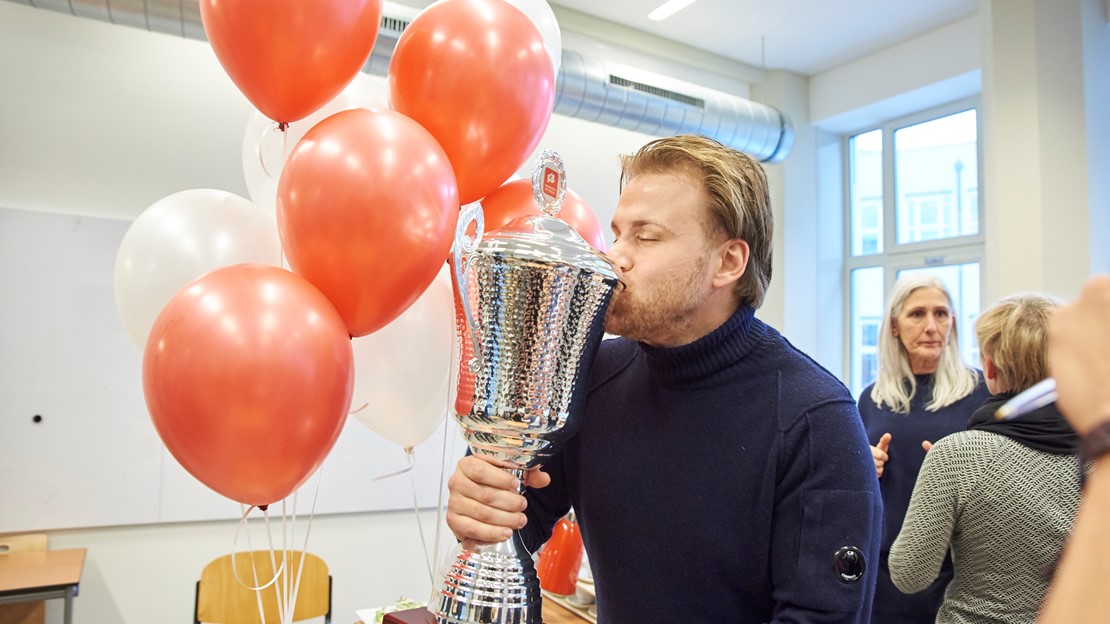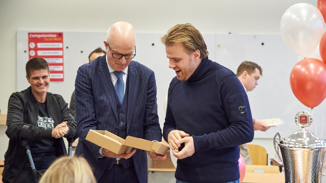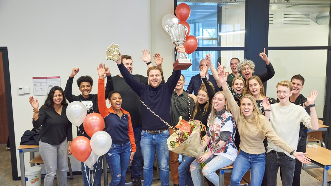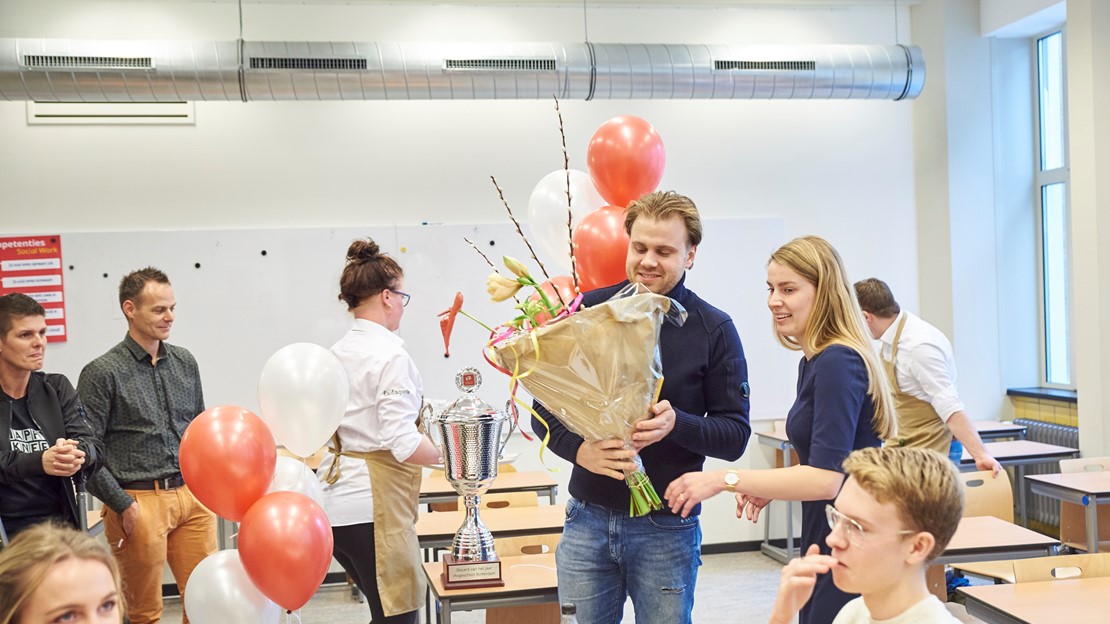 Tim, die de wisselbeker aan zijn docent mocht overhandigen, sluit zich volledig aan bij alle lovende kritieken. Ook hij is dolblij dat Simon zijn docent is. “Dat raakt me echt”, zegt de winnaar. “Tussen de regels door merk ik af en toe best dat studenten waarderen wat ik doe, maar deze vorm van waardering heb ik nog nooit gehad.”