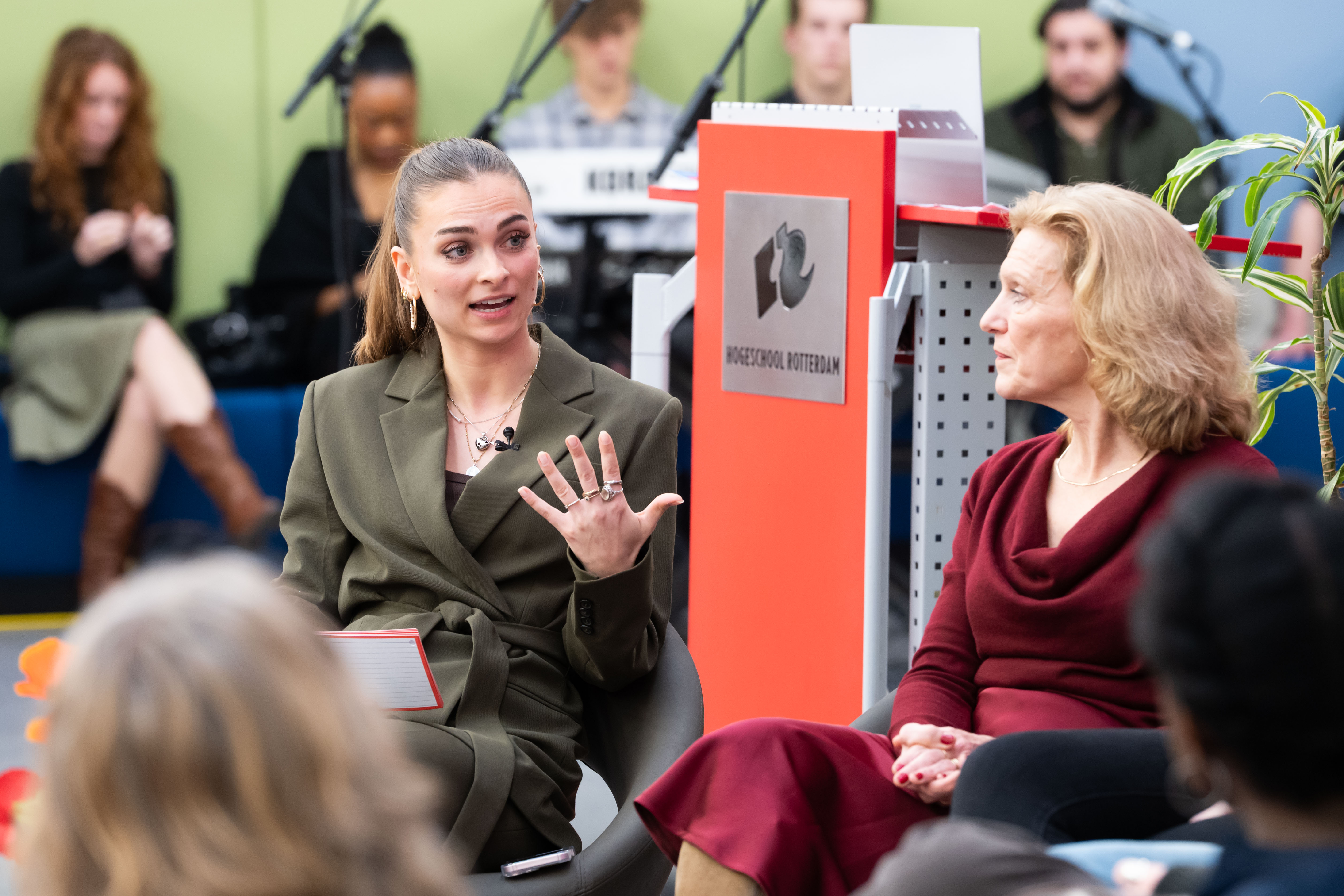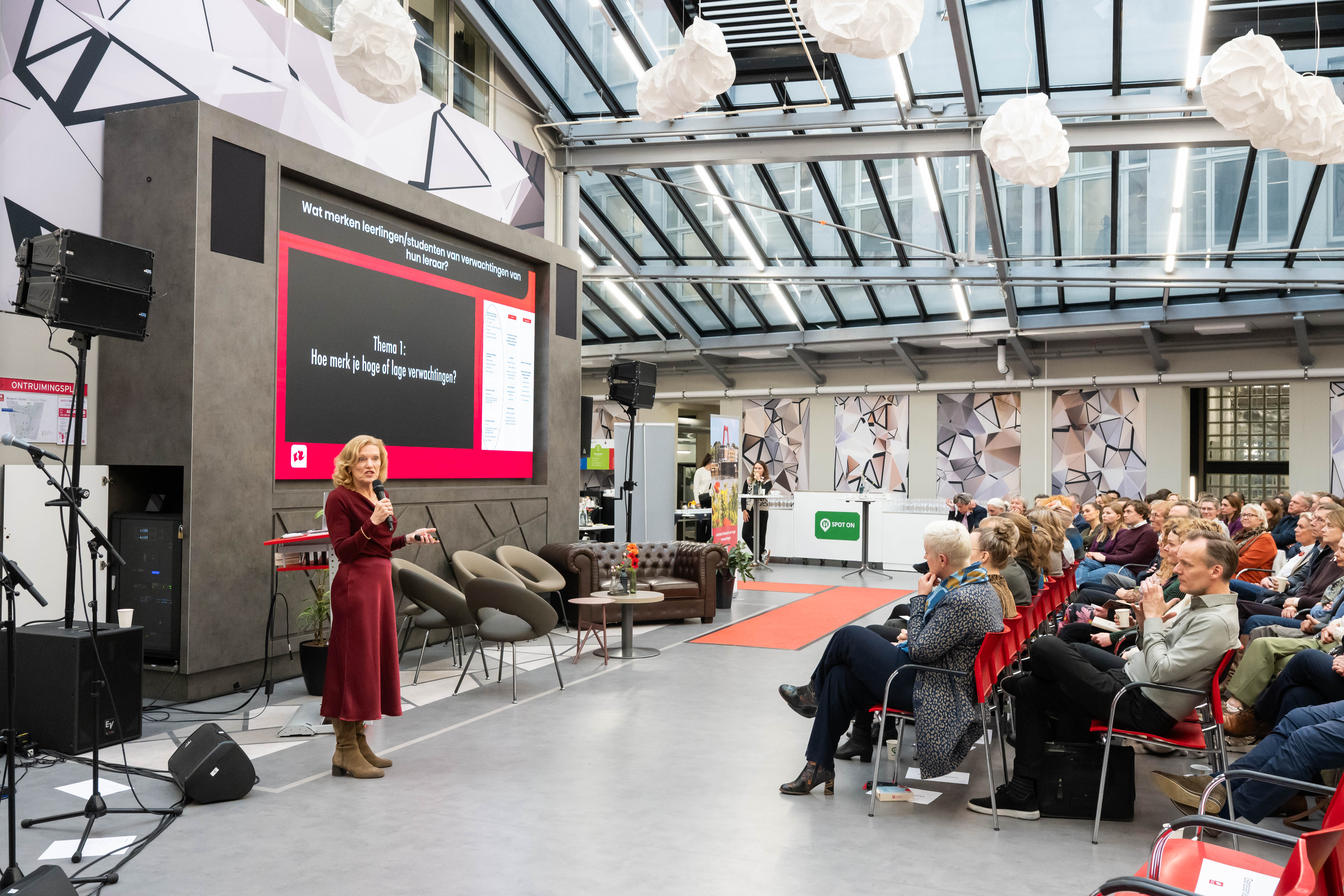 Voor een volle zaal bij locatie Museumpark van Hogeschool Rotterdam schetste Jarise in haar rede helder wat we verstaan onder hoge verwachtingen: het vertrouwen dat iedere leerling kan leren en zich kan ontwikkelen. Bij de didactiek van hoge verwachtingen staan doelgerichtheid, leerbevorderende interactie en activerende didactiek vanuit een positieve pedagogische grondhouding centraal. De leraar maakt het vertrouwen zichtbaar door het stellen van ambitieuze doelen. Maar ook door hoge verwachtingen uit te dragen in hun gedrag in het moment van interactie met de leerling en door passende ondersteuning te bieden.