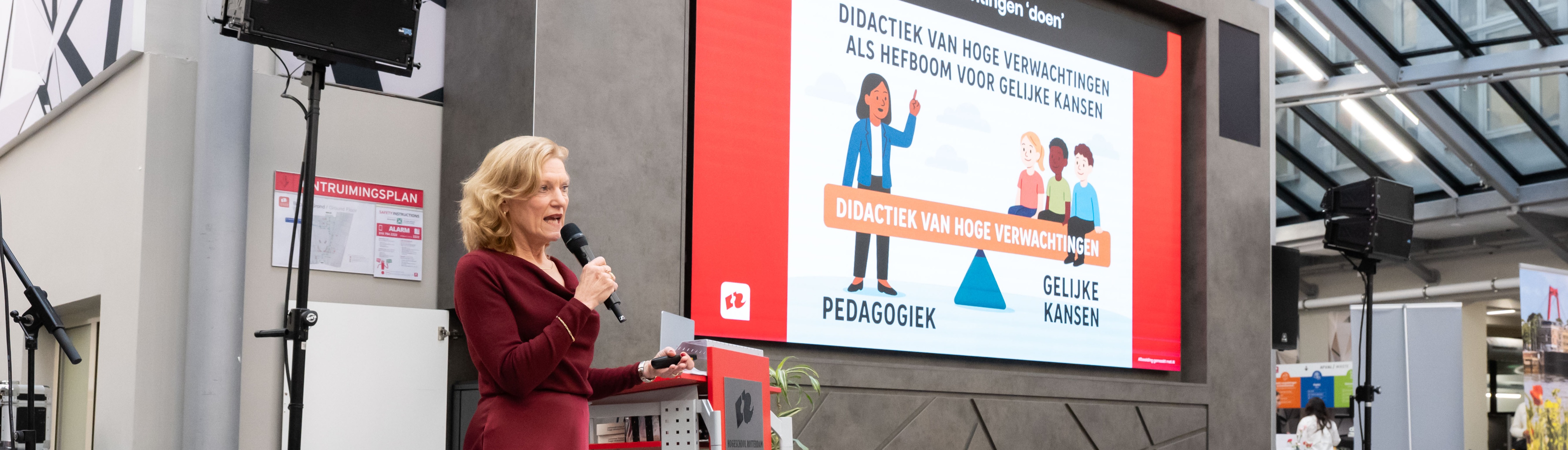 Voor een volle zaal bij locatie Museumpark van Hogeschool Rotterdam schetste Jarise in haar rede helder wat we verstaan onder hoge verwachtingen: het vertrouwen dat iedere leerling kan leren en zich kan ontwikkelen. Bij de didactiek van hoge verwachtingen staan doelgerichtheid, leerbevorderende interactie en activerende didactiek vanuit een positieve pedagogische grondhouding centraal. De leraar maakt het vertrouwen zichtbaar door het stellen van ambitieuze doelen. Maar ook door hoge verwachtingen uit te dragen in hun gedrag in het moment van interactie met de leerling en door passende ondersteuning te bieden.