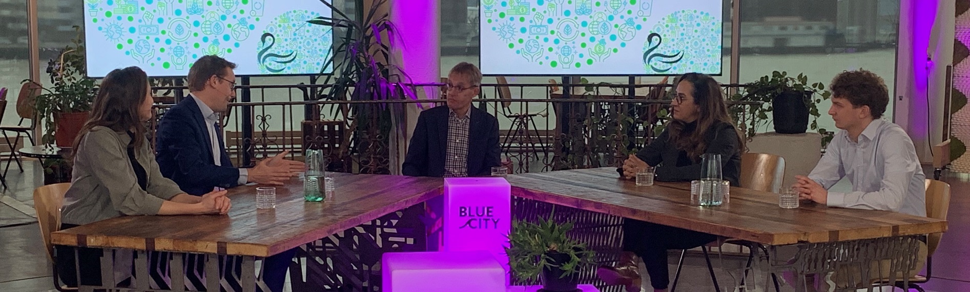 Hoe gaan we dat dan doen, vraagt gespreksleider Arjen van Klink, lector Next Strategy, waarbij hij ook wethouder Arno Bonte (Duurzaamheid, Luchtkwaliteit en Energietransitie) en Sabine Biesheuvel (Klimaattafel consumentengoederen Rotterdam Climate Agreement) aankijkt.
