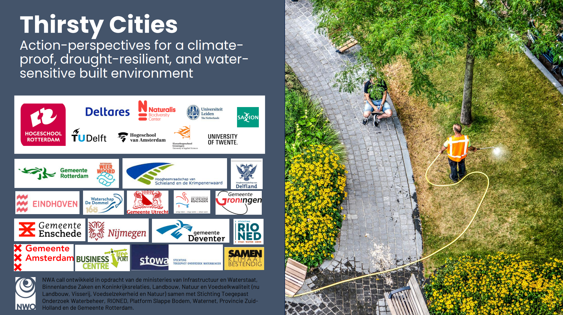 Thirsty Cities wordt uitgevoerd door een onderzoeksconsortium van 9 kennisinstellingen en >20 praktijkpartners en landelijke netwerkpartners.